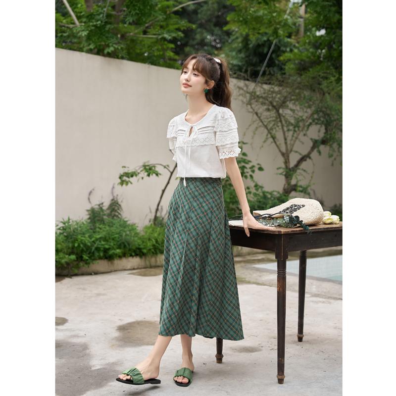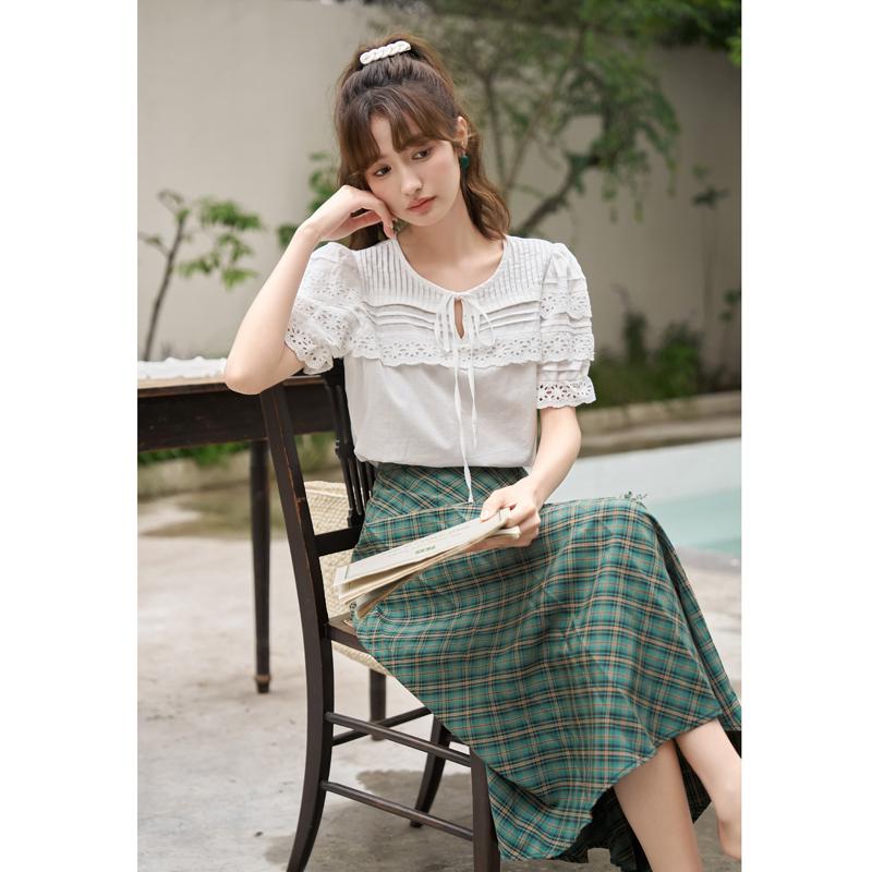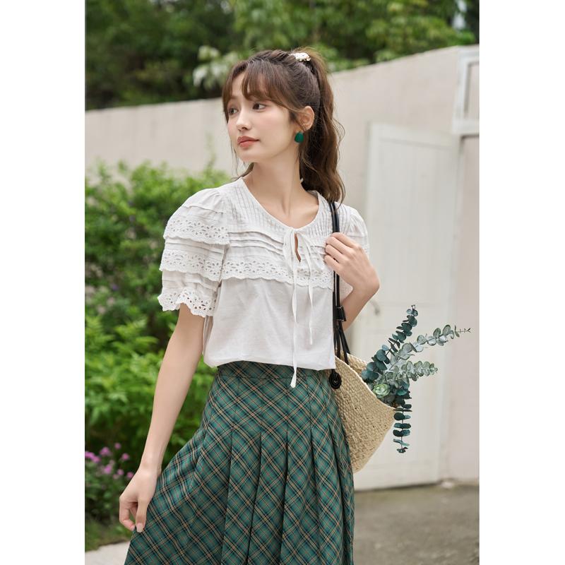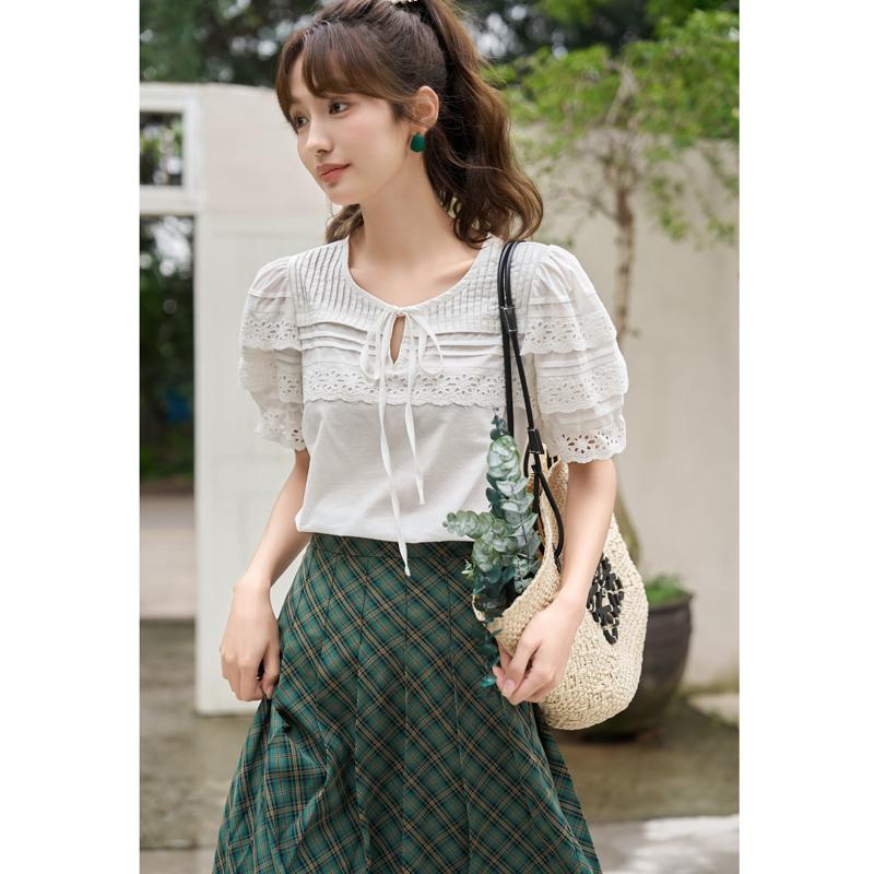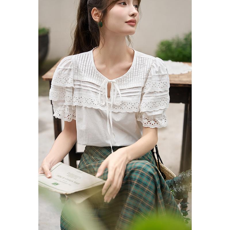 Mishow Женская блузка, новинка 2023 года, лето, 100% хлопок, дышащий мягкий кружевной дизайн, однотонный пуловер с пышными рукавами и круглым вырезом, топы MXC35X0061