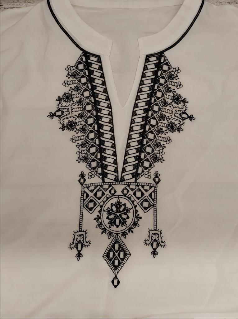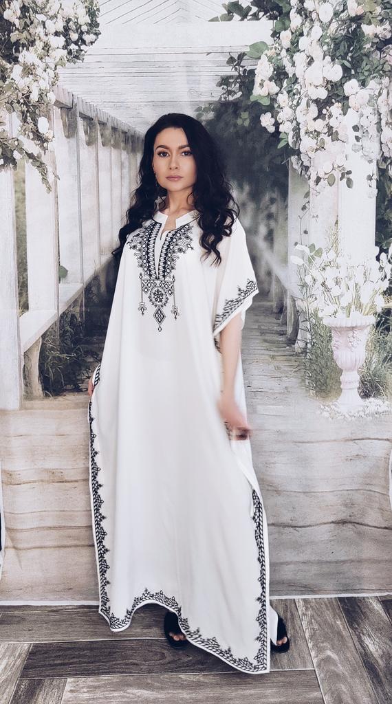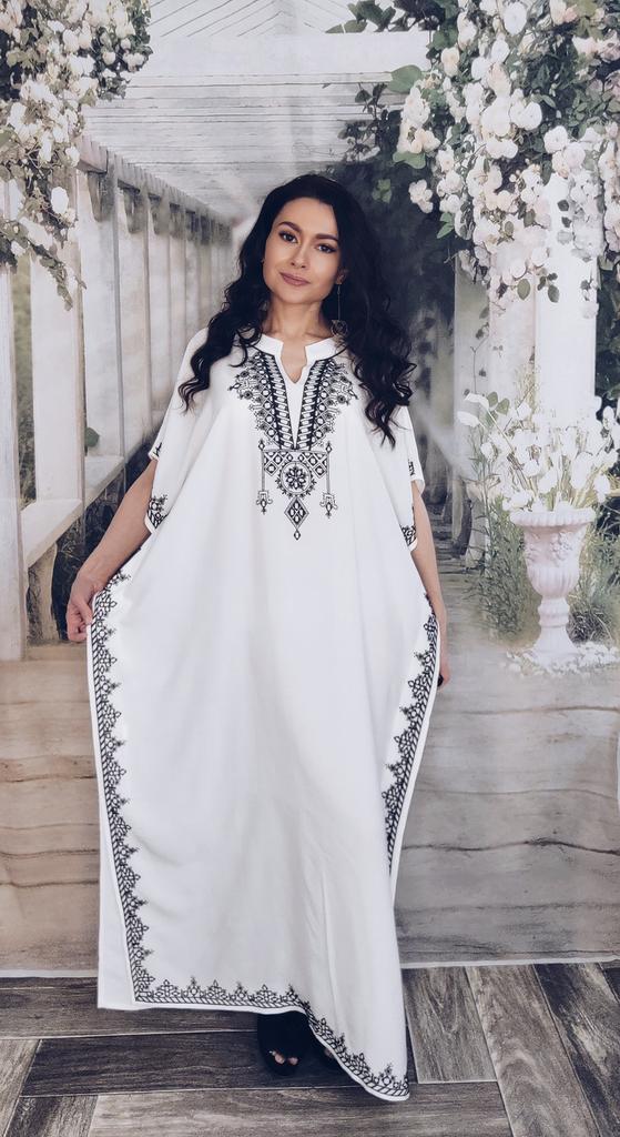 Красивое пляжное/домашнее платье из вискозы в этно стиле Платье идёт в едином размере. Цвет: белоснежный с чёрной вышивкой. Платье - туника в этно стиле идеально подойдёт для любой фигуры, а также может стать шикарным домашним платьем. Вискоза идеально подходит для лета, так как даёт небольшой холодящий эффект. Материал: 100% вискоза, струящаяся, нежная, очень приятная к телу, немного холодит, не электризуется, не тянется, просвечивает умеренно (чёрный купальник будет просвечивать), хорошо гладится, мнётся, но всё же не так сильно, как хлопок. Пошито платье идеально ровно и аккуратно. Очень красивая вышивка. Посторонних запахов не было. Точные замеры платья между боковыми швами в области груди -- 140 см. Крой свободный -- прямой. Длина изделия -- 133 см. По бокам разрезы неглубокие (колено прикрыто). Мои параметры ОГ - 93 см, ОБ - 93 см, рост -- 163 см. На мне, естественно, сидит очень свободно. Подойдёт и на высокий рост. Платье красивое, качественное. Если искали что-то подобное, то присмотритесь. Всем удачных покупок, хорошего настроения, мира в душе.