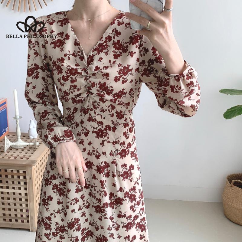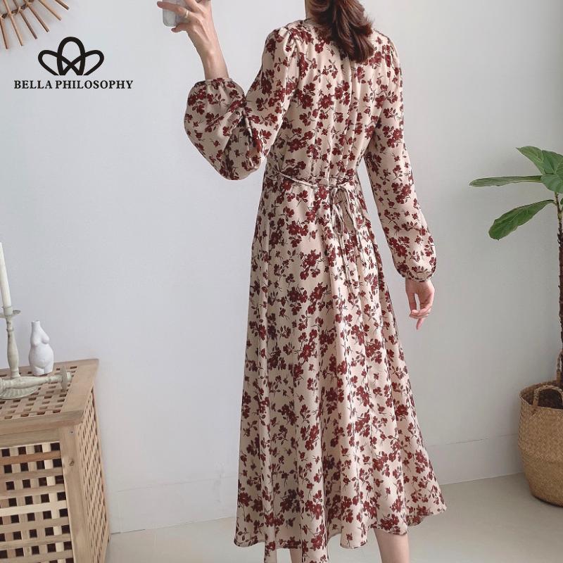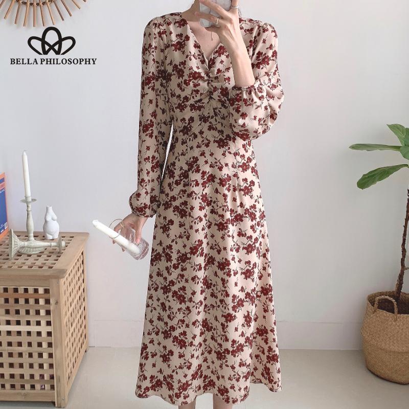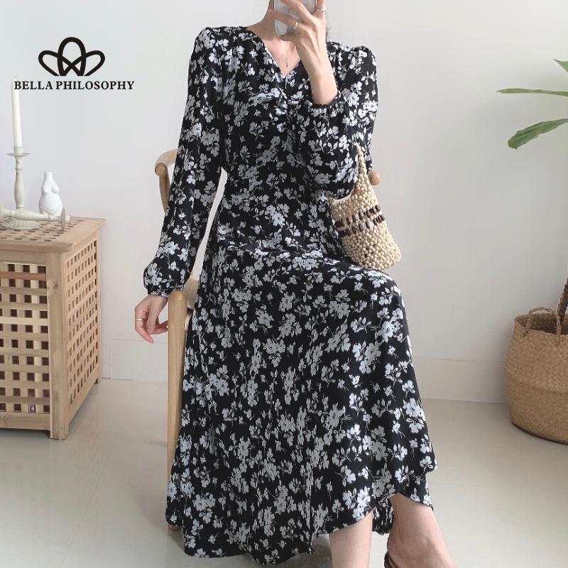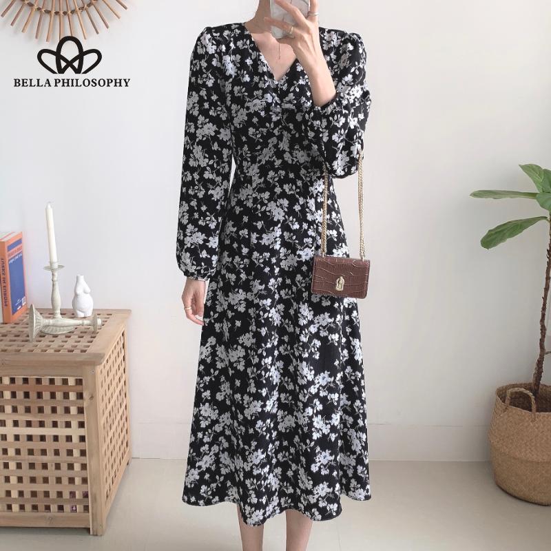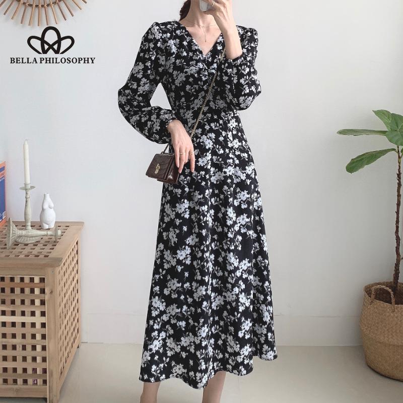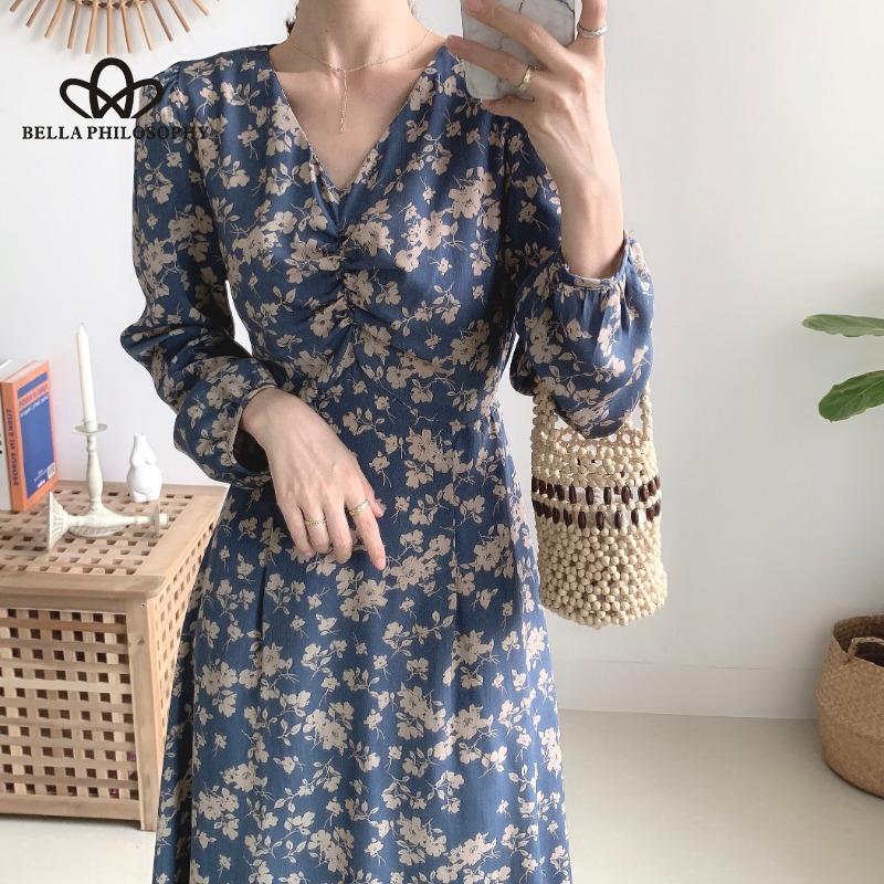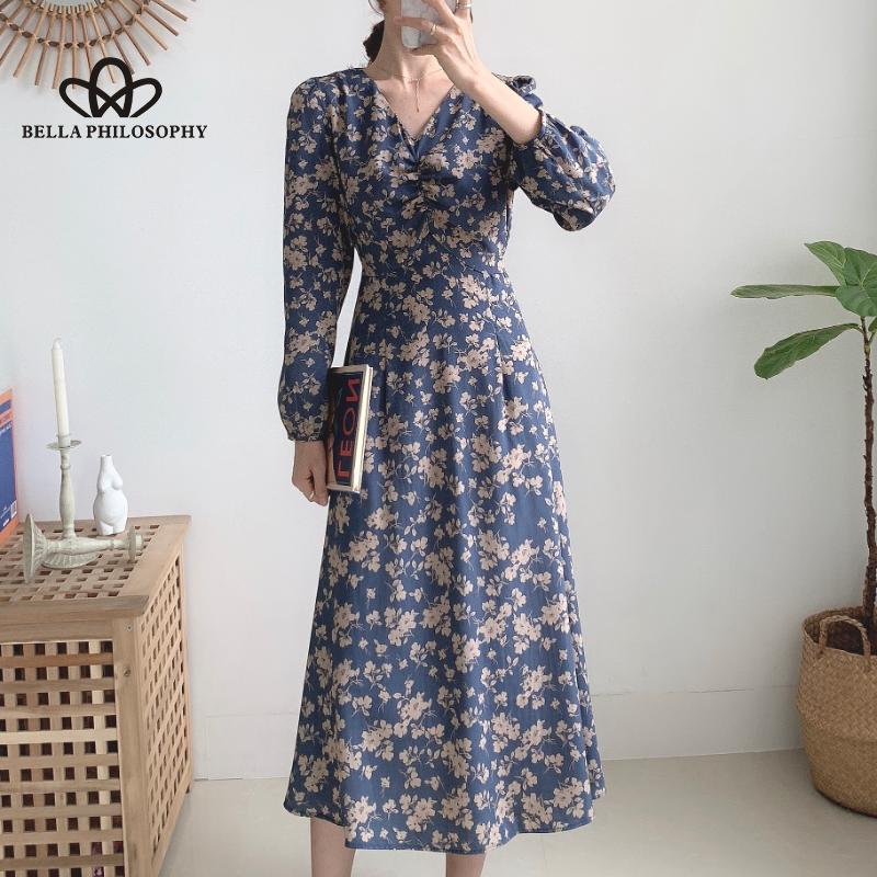 Женское осенне-весеннее синее длинное платье с v-образным вырезом и длинными рукавами с цветочным принтом, повседневное элегантное платье с принтом Florla