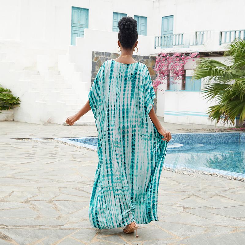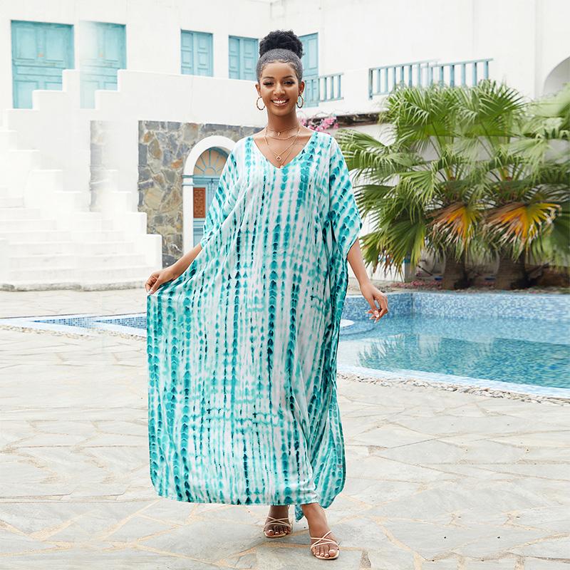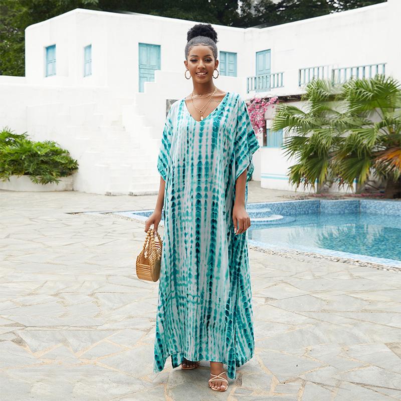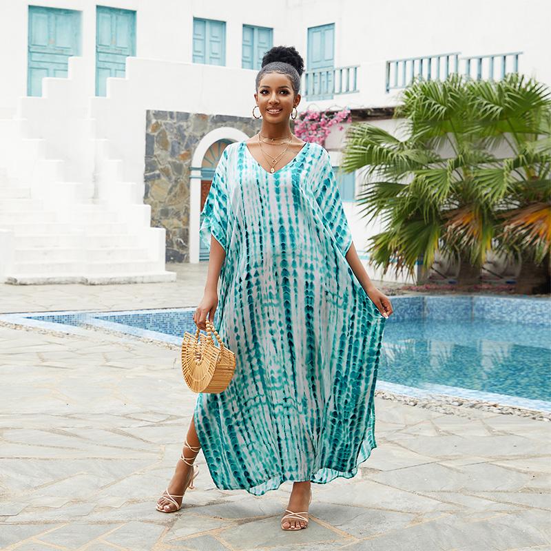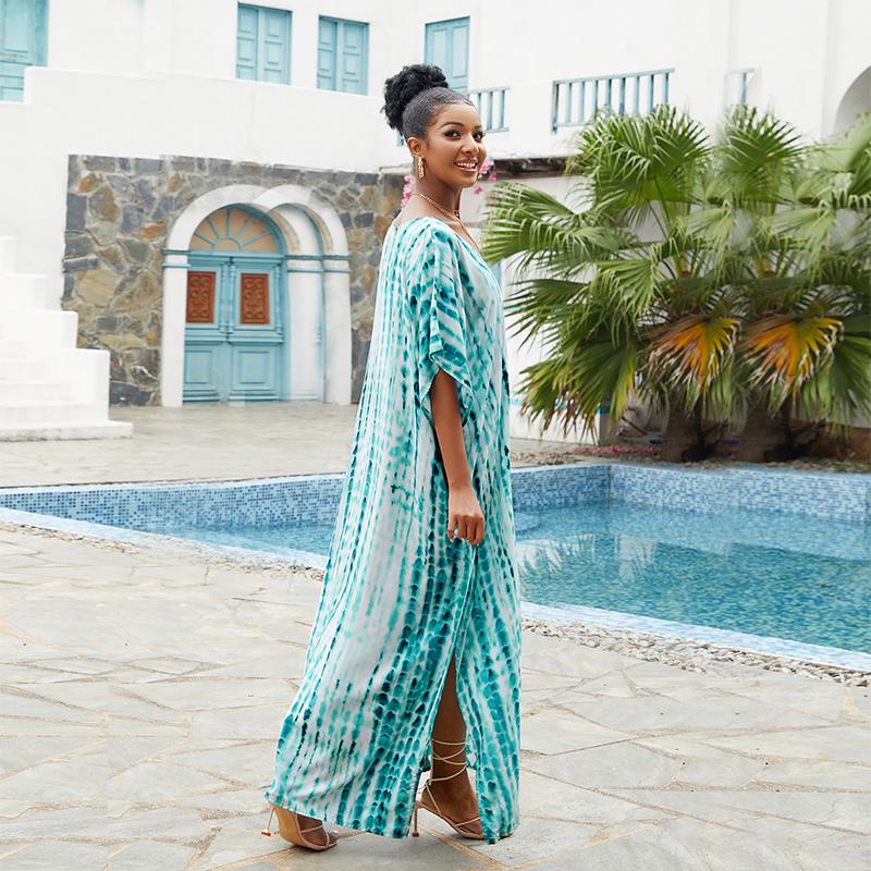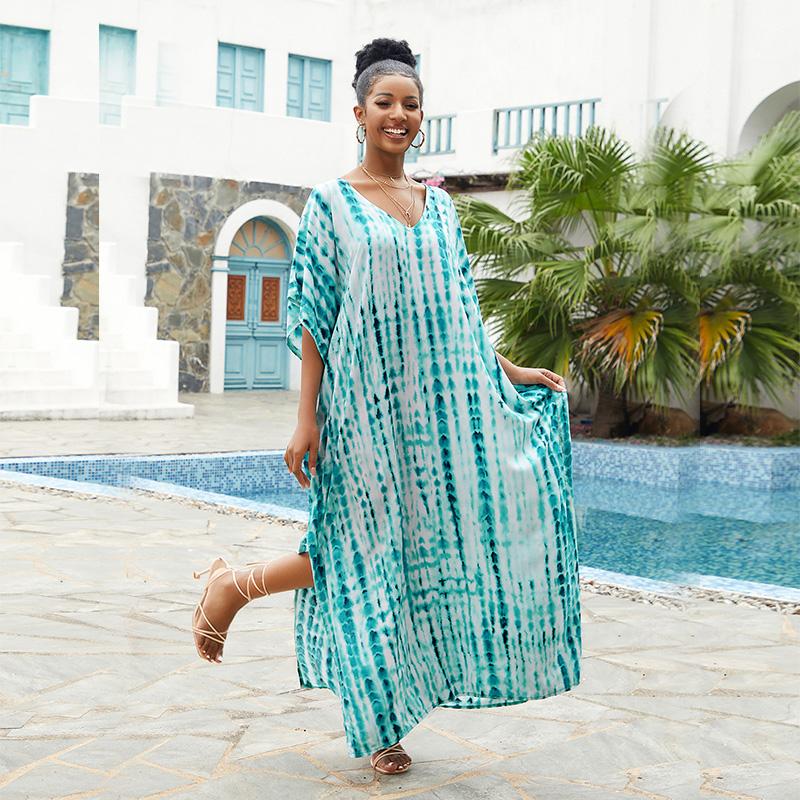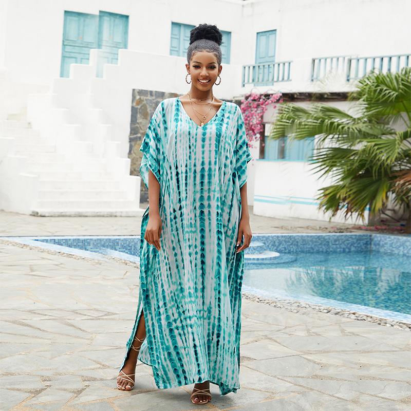 EDOLYNSA Женское летнее платье макси с коротким рукавом и V-образным вырезом, повседневные свободные длинные пляжные платья с разрезом, одежда для дома больших размеров, кафтан, купальник, прикрытие Q1218