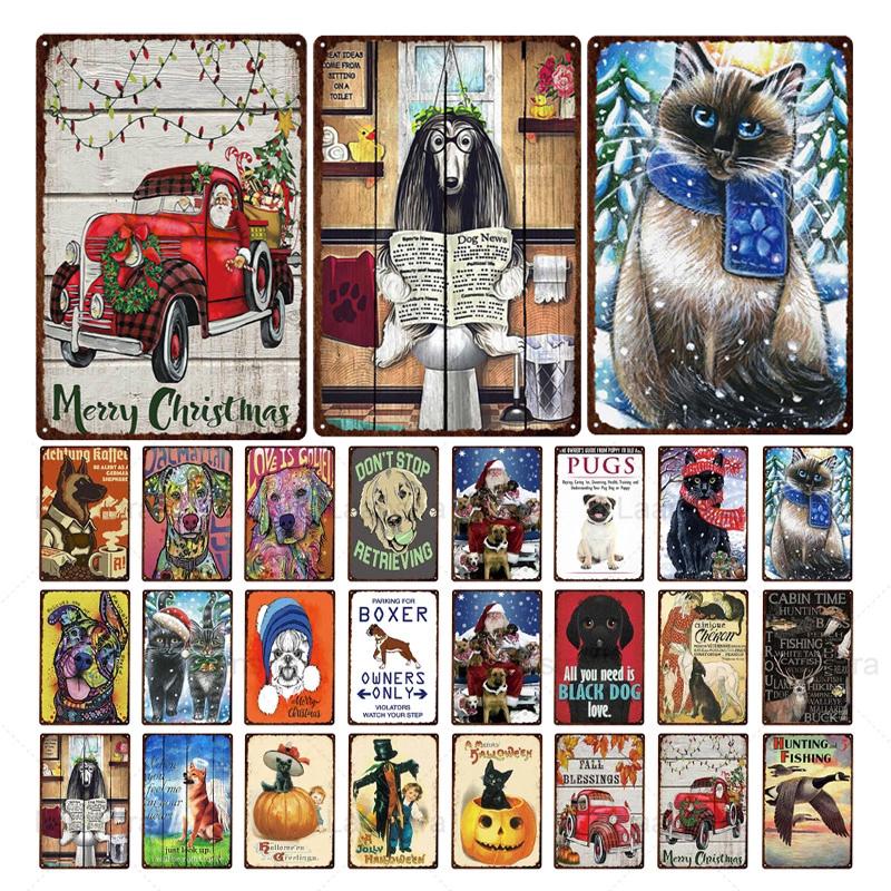Рождественский Санта-Клаус, собака и кошка, жестяная вывеска, настенная художественная живопись, винтажный декор, постер, металлические вывески, бар, кафе, зоомагазин, домашний декор