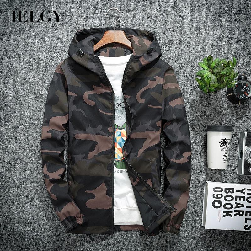 IELGY Мужская одежда, куртка, молния, камуфляж, черный, с длинным рукавом, повседневный корейский стиль, модный капюшон