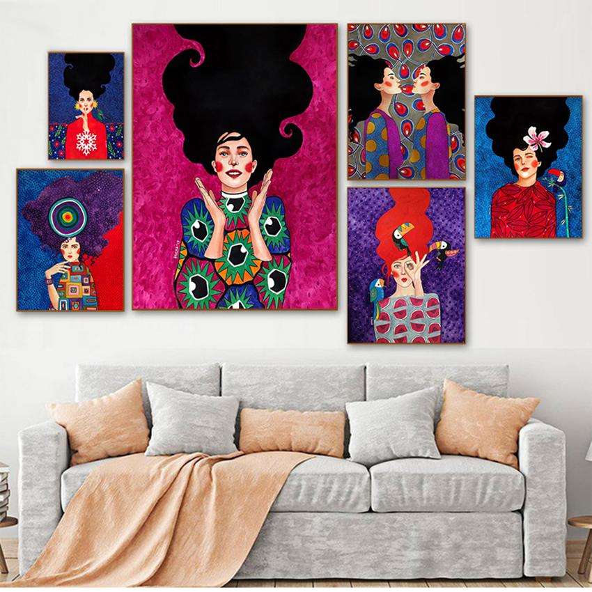 Настенные панно Cuadros для гостиной, винтажные без рамы, абстрактные красочные девушки, настенная живопись на холсте, плакат на скандинавскую тему, цветочные волосы