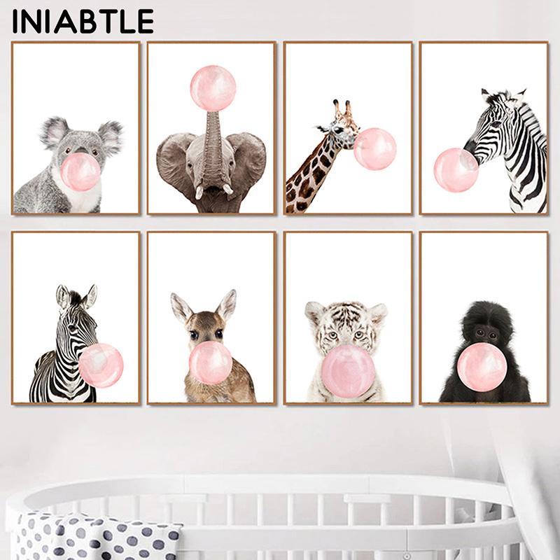 Розовый пузырь слон Жираф плакат с принтом животных детская настенная живопись на холсте детская картина скандинавская детская комната украшения
