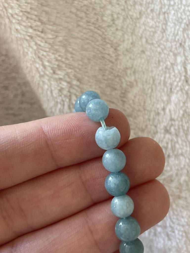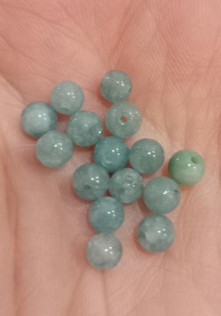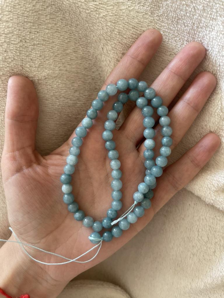 На нитке 69 бусин аквамарина. Камень натуральный, но подкрашенный. Пара бусин сколота, но в изделии будет незаметно. Цвет чуть более насыщенный, чем на фото, яркий голубой. В целом, заказом довольна. Натуральные камни заказываю тут впервые, первый опыт удался.