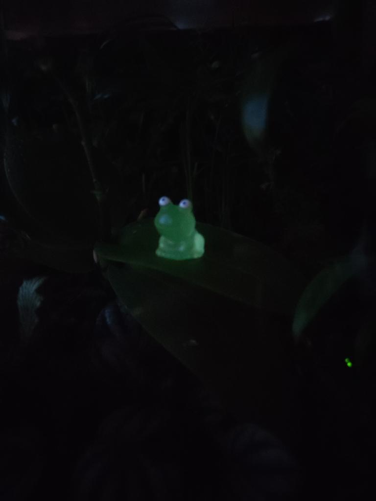 Очень маленькая, очень симпатичная светящаяся в темноте лягушка. Теперь она живёт на орхидее).