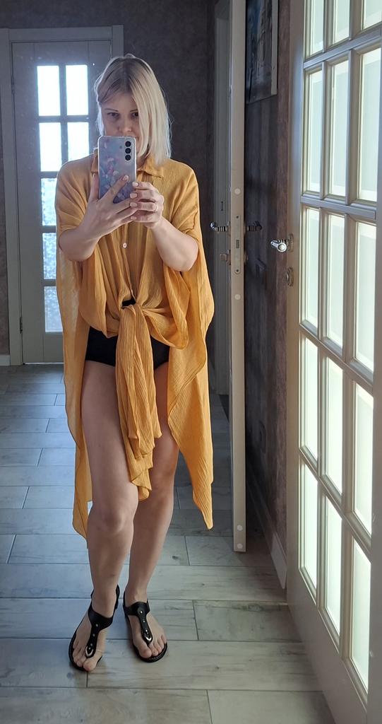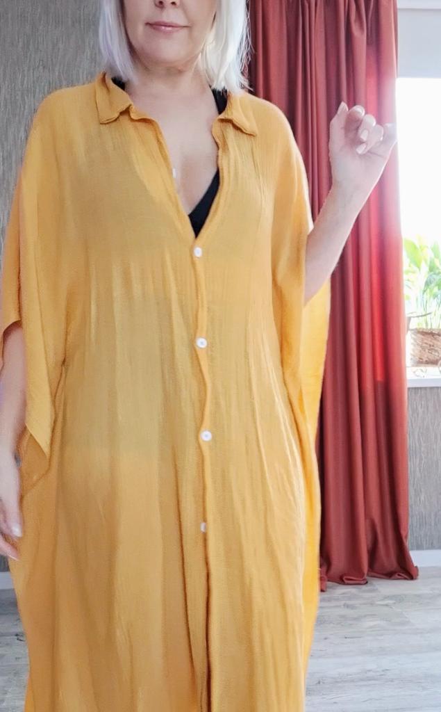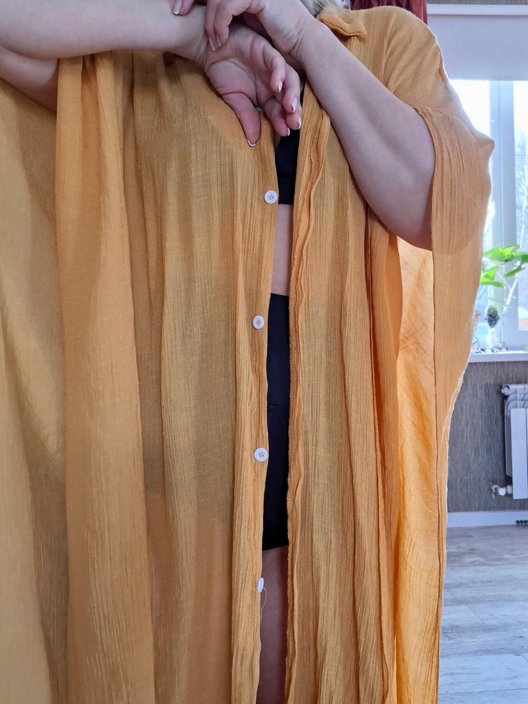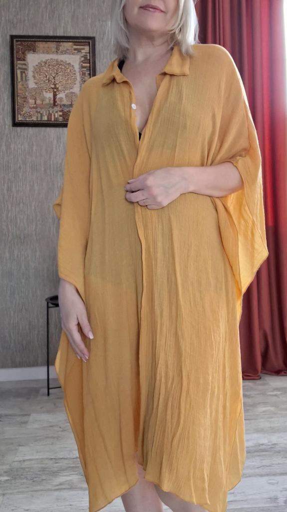 УДОБНАЯ, ВОЗДУШНАЯ,СТИЛЬНАЯ ПЛЯЖНАЯ НАКИДКА Один размер ,цвет на выбор,благо он есть. Мне очень понравилась в этом жёлтом раскрасе. Материал лёгкий, не сильно мнущийся,с примесью синтетики, жатка.. На 44 размер смотрится отлично. Можно зафиксировать на талии ремешок, можно использовать,как накидку,не застегивая на пуговки, а так же просто завязать передний подол в узел. Шикарная, не очень дорогая летняя вещичка.❤️
