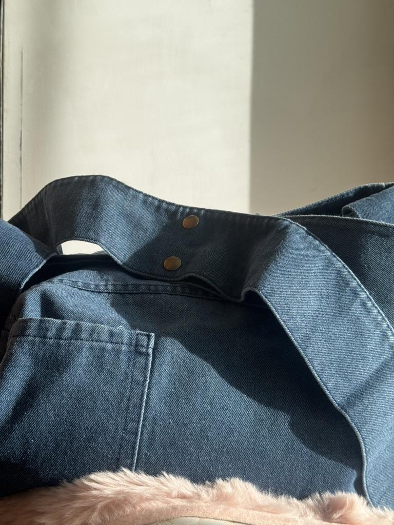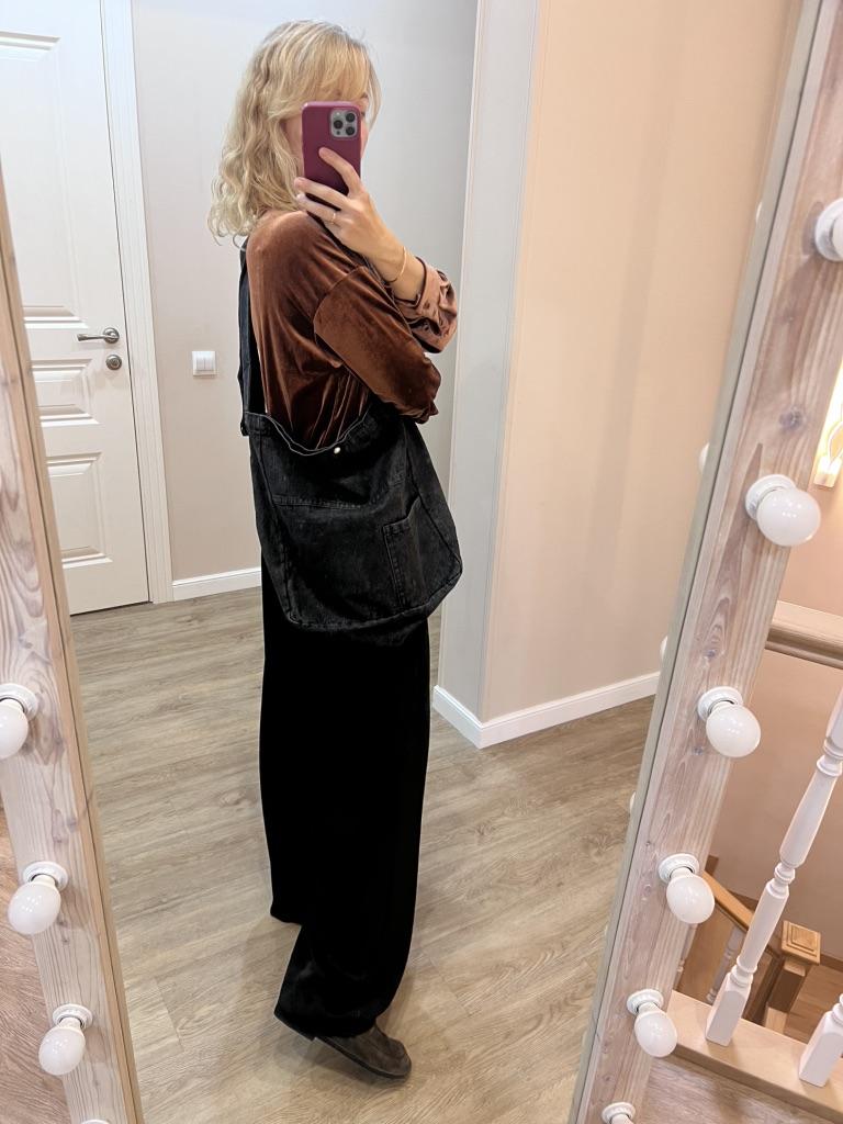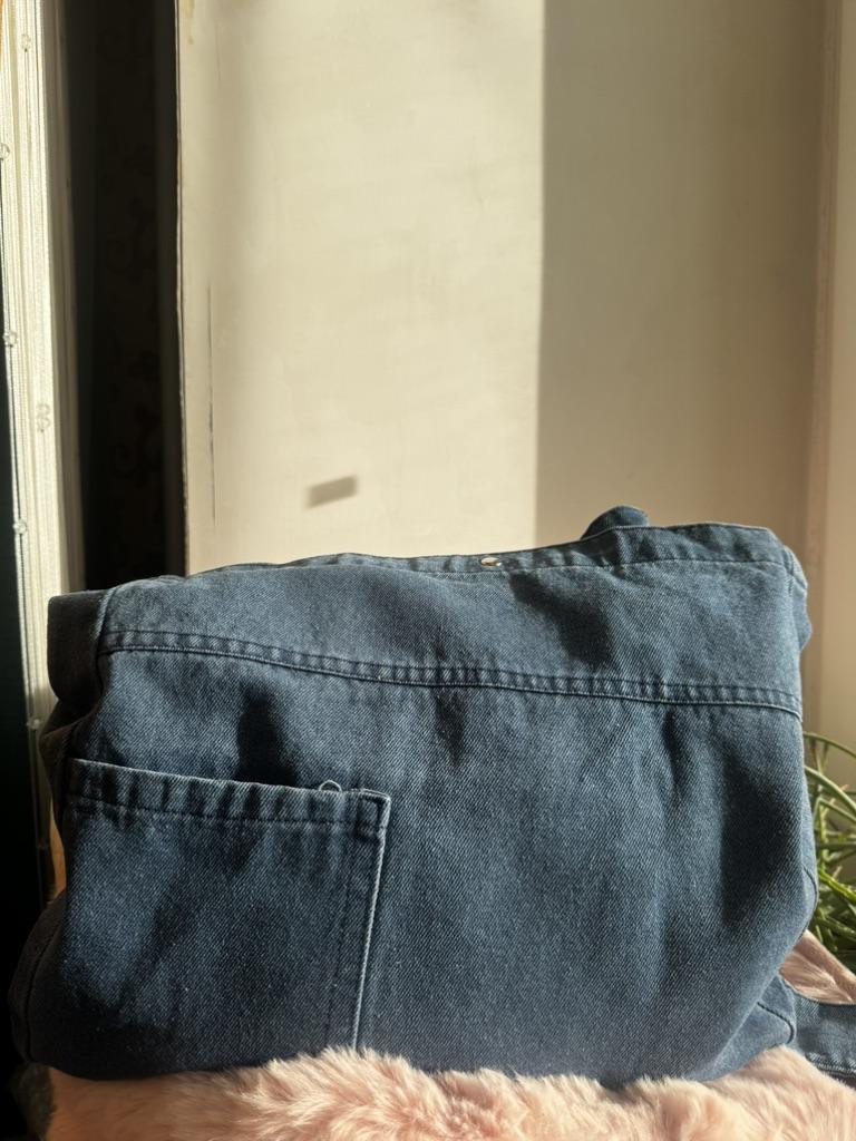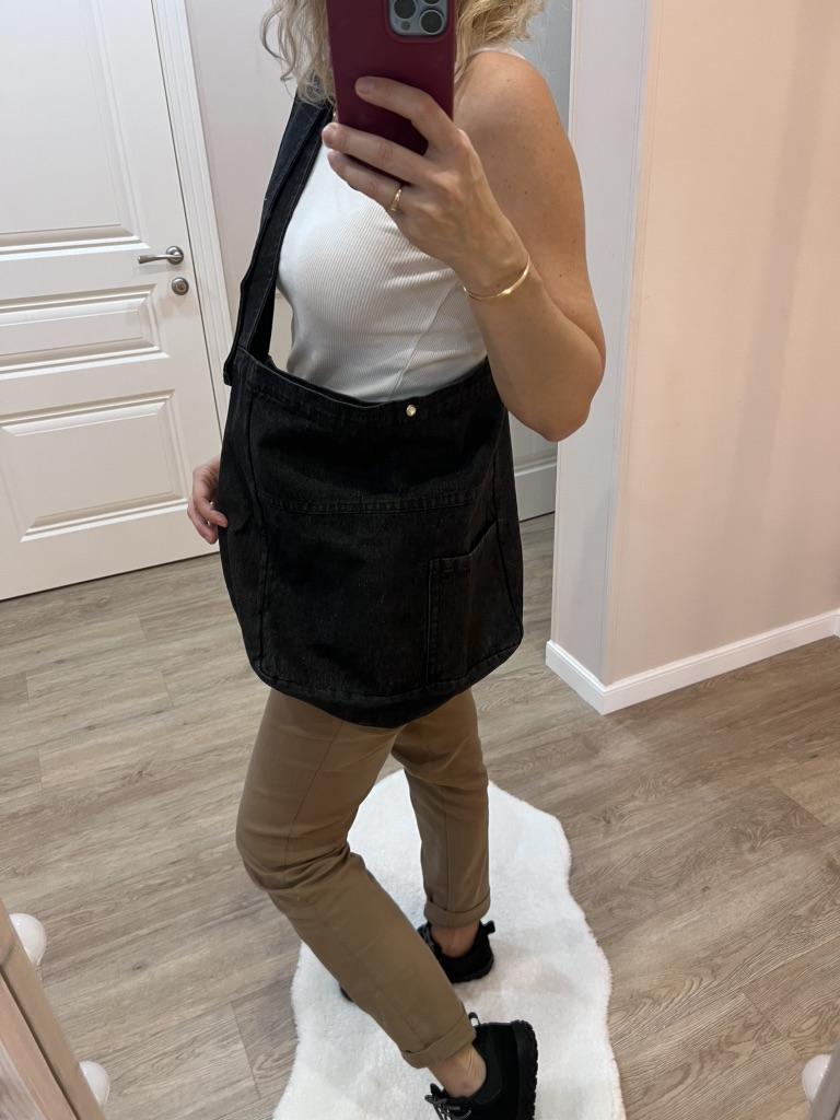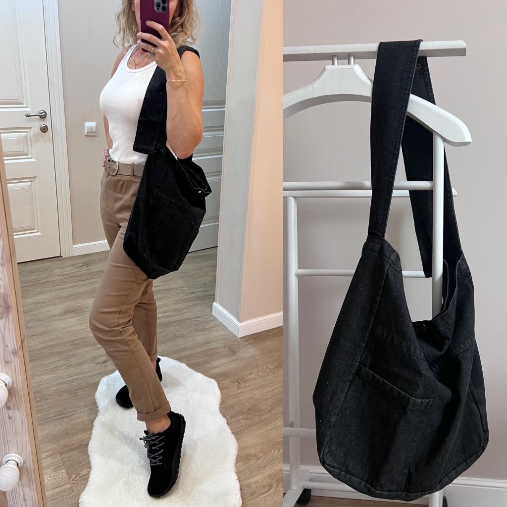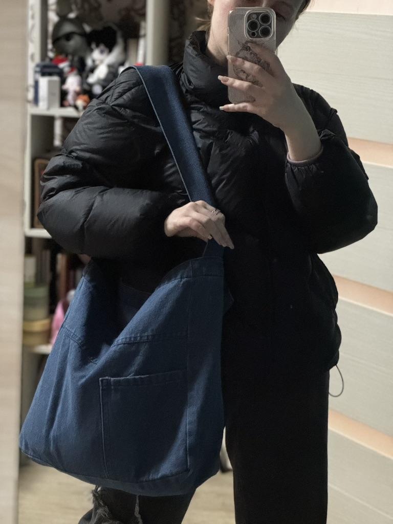 Большая джинсовая сумка 💅🏻 Очень хорошая, плотная джинса. Вместительная сама по себе, большая. Как шоппер — просто отлично. Из карманов есть только тот, что на передней части внешний. Внутри карманов нет. Есть клепка на магните, на которую сумка закрывается. Единственная деталь: она не настолько темная, как на фото продавца. Ближе к тому, как она выглядит на первых фото. Чисто с товаром светловато получилось.