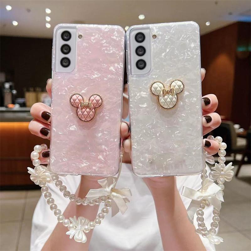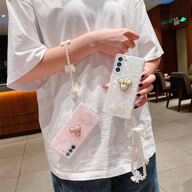 Прозрачный чехол с милым мультяшным медведем для Samsung Z Flip3 4 S23 S22 Ultra S21 S20 A14 A24 A54 A13 A23 A33 A53 A32 A52 с жемчужным ремешком с бантом