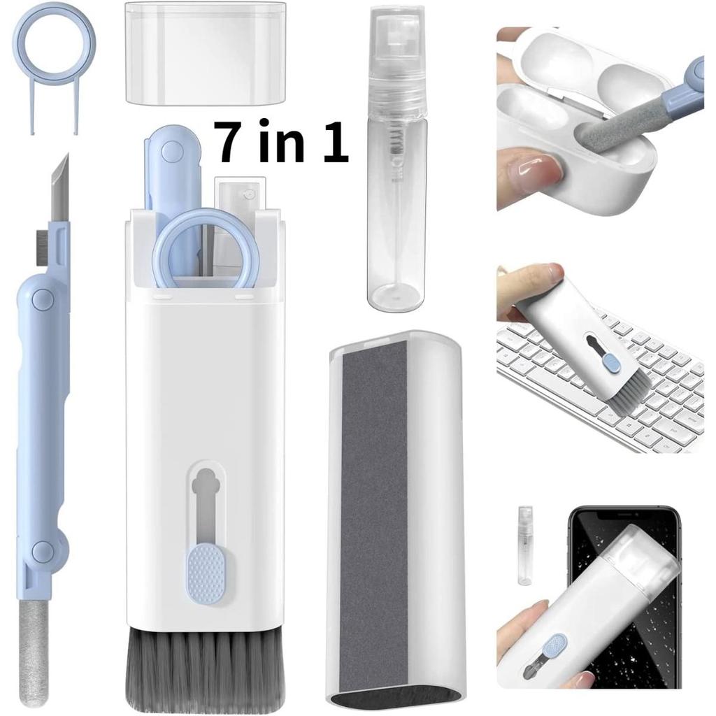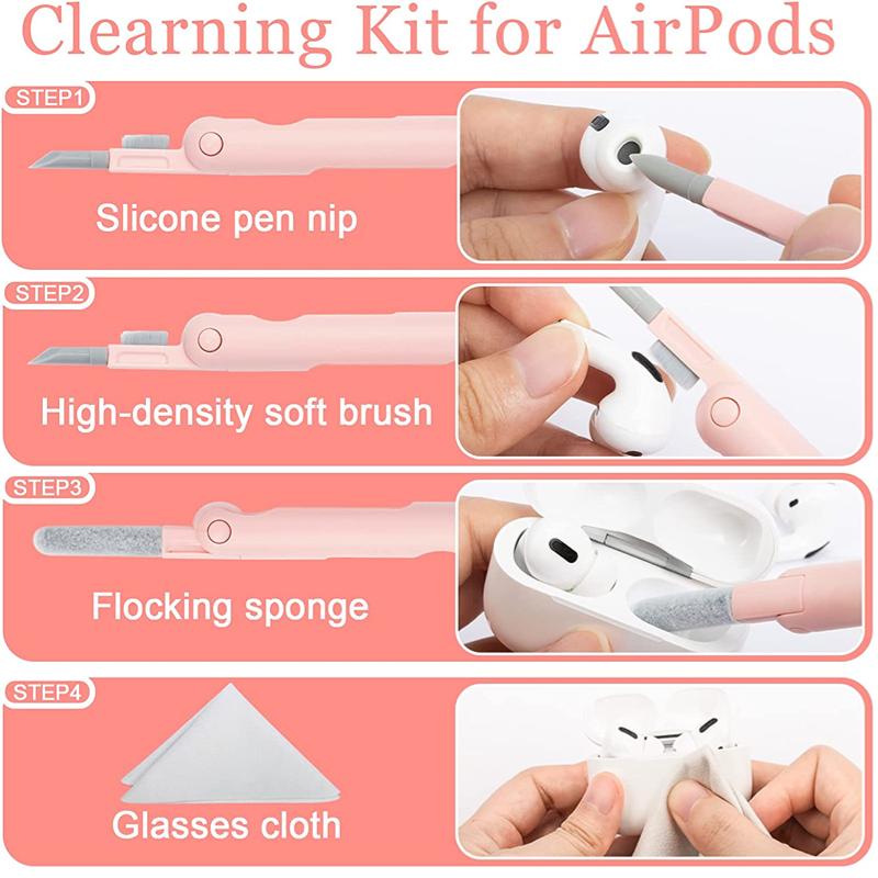 【Многофункциональный набор для чистки 7 в 1】 Электронный набор для чистки включает в себя чистящую ручку для Airpods с силиконовым наконечником, мини-щетку и щетку-губку с флокированием.; мягкая щетка высокой плотности, очищающий флакон с распылителем(пустой), волоконный флисовый свайп и пряжка для ключей. Комплекты могут чистить наушники, клавиатуры, мониторы ПК, телефоны, камеры и т. Д.