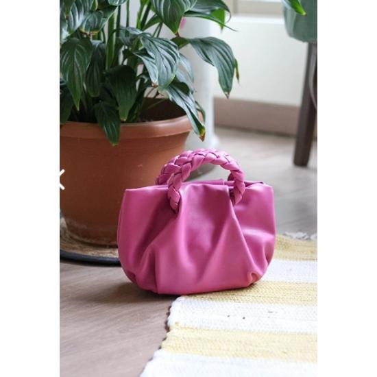 Женская сумка на плечо из мягкой кожи с вязаной ручкой цвета фуксии