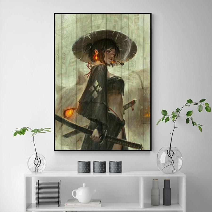 Японский меч самурай воин искусство гейша женщина плакаты и принты настенная живопись на холсте печать для гостиной домашний декор без рамки