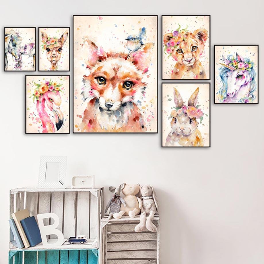 Картины на холсте, домашний декор, настенная живопись, кролик, лиса, фламинго, принты, креативный акварельный плакат на скандинавскую тему, модульная гостиная, без рамки