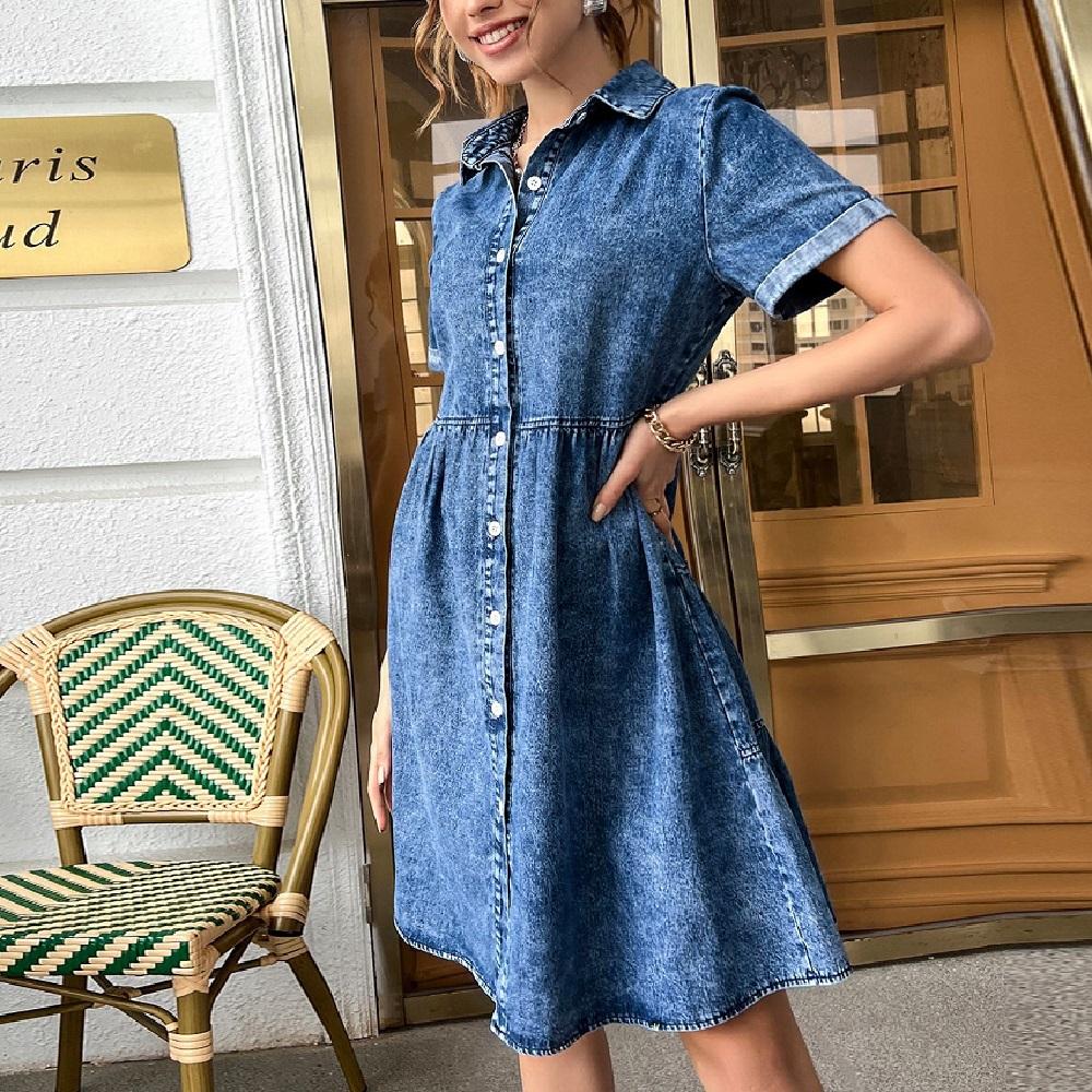 Женские летние джинсовые платья, однобортное джинсовое платье на пуговицах, платья длиной до колена с коротким рукавом и отложным воротником — купить товар онлайн с бесплатной доставкой до всему миру!
