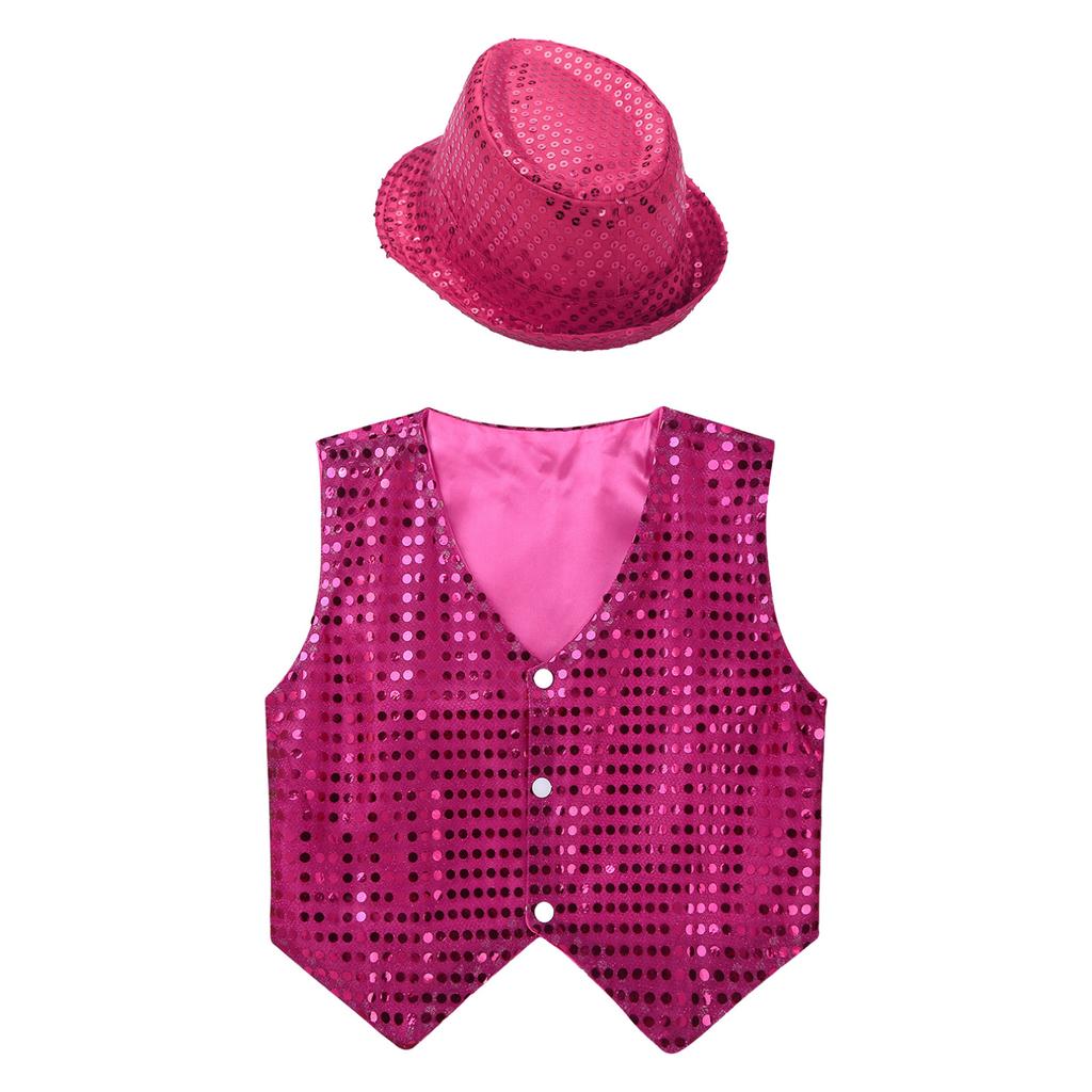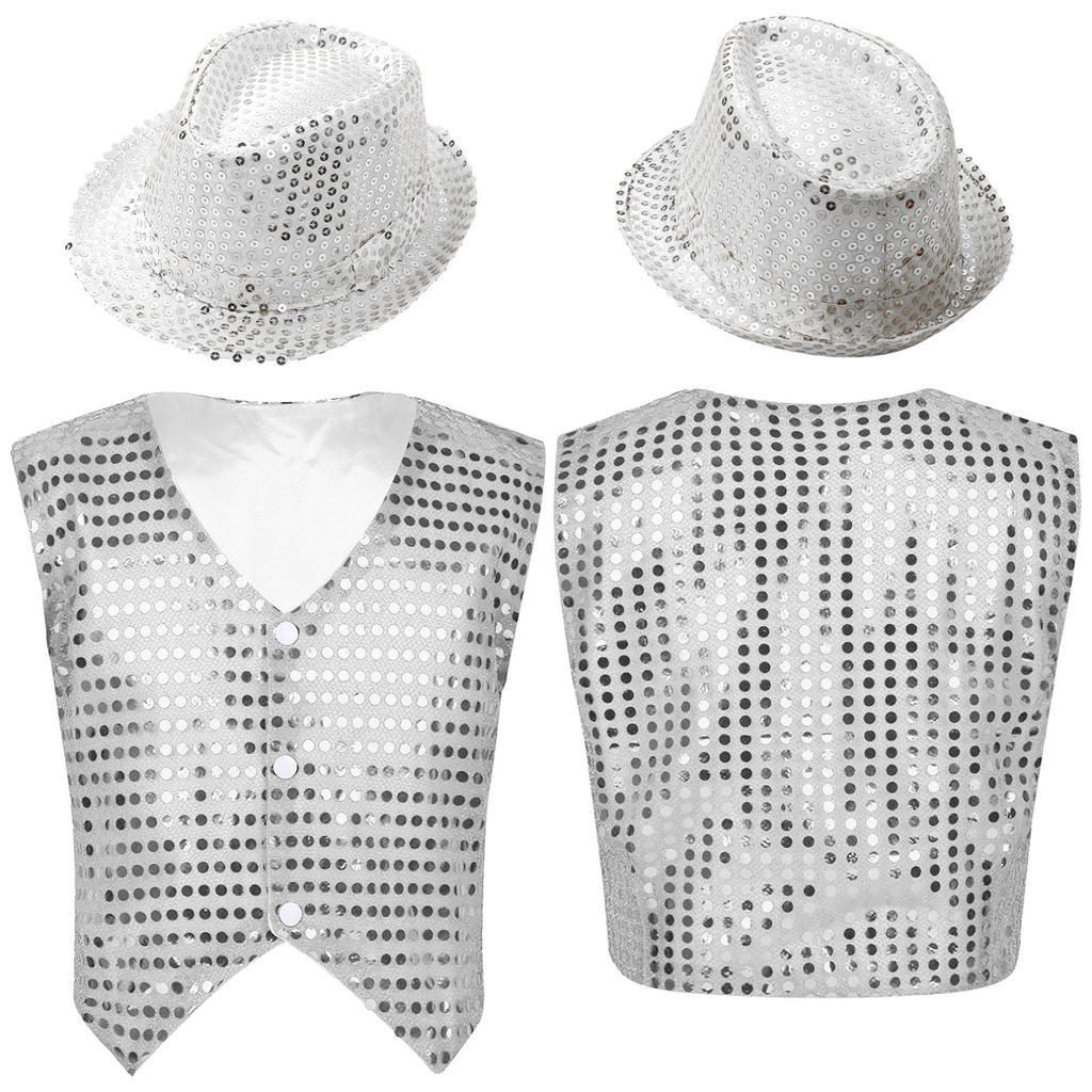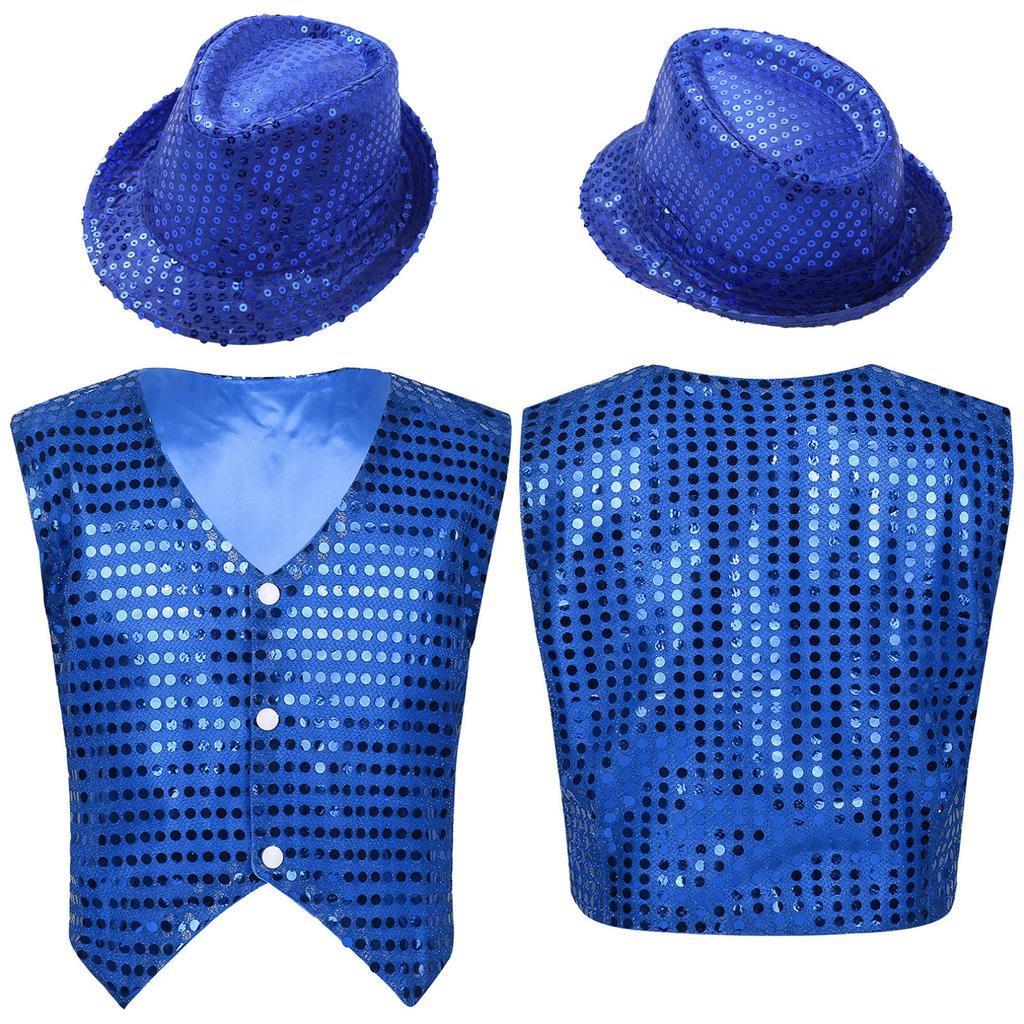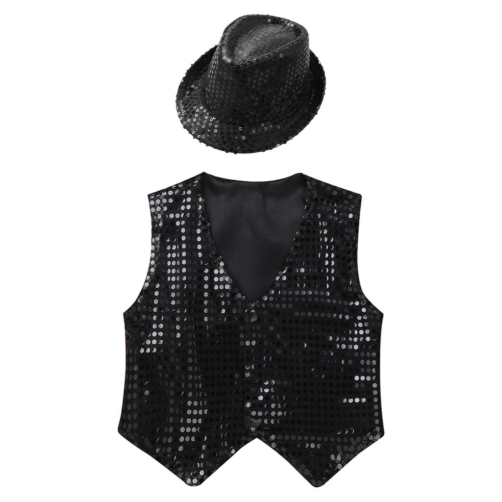 Жилет с блестками для мальчиков и девочек, жилет, топ, куртка в стиле хип-хоп, джаз, уличный современный танец, костюм для вечеринки со шляпой