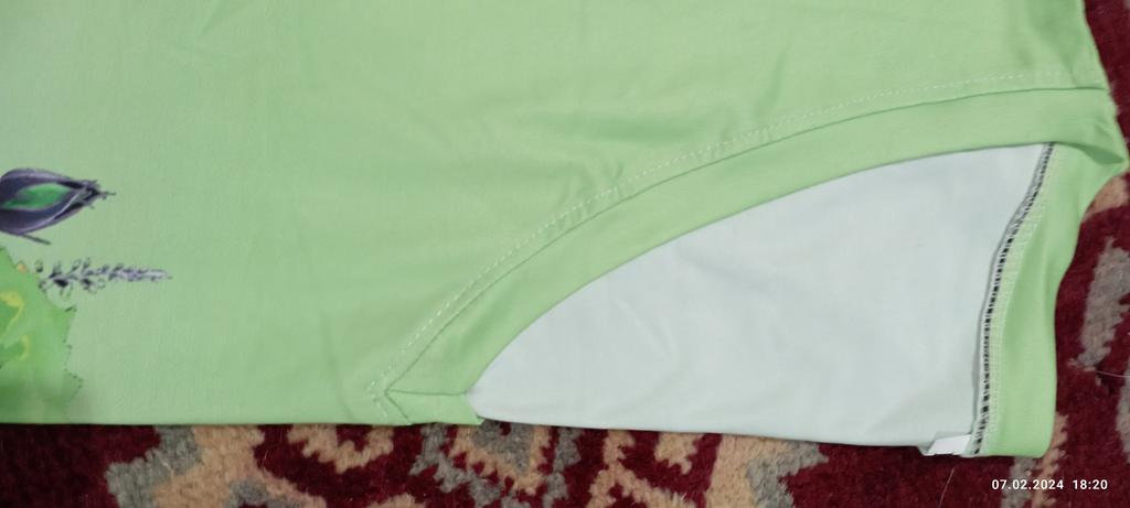 Получила сегодня футболку с 3D принтом цвет мяты. Размер заказывала по ОГ 100, у меня ОГ102, но такого не было, а был ОГ104, а он на меня большой. Футболка синтетика, но приятная к телу, без зАпаха, тянется, цвет яркий насыщенный, но пошив неаккуратный, с браком. Вырез V-образный перекошен, расстояние от горловины до рукава с одной стороны 12 см, а с другой стороны 13см. Разочарована. Посылка в Украину шла 22 дня, за что большое спасибо. Вернули 50% от стоимости товара, за что отдельное спасибо СП.