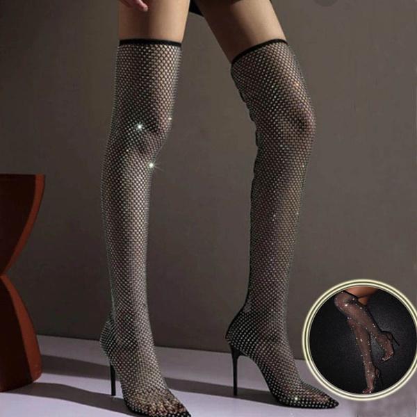 Женские пикантные сапоги выше колена со стразами, черные сапоги до колена на шпильке с острым носком, сетчатые носки в сетку, сапоги на высоком каблуке