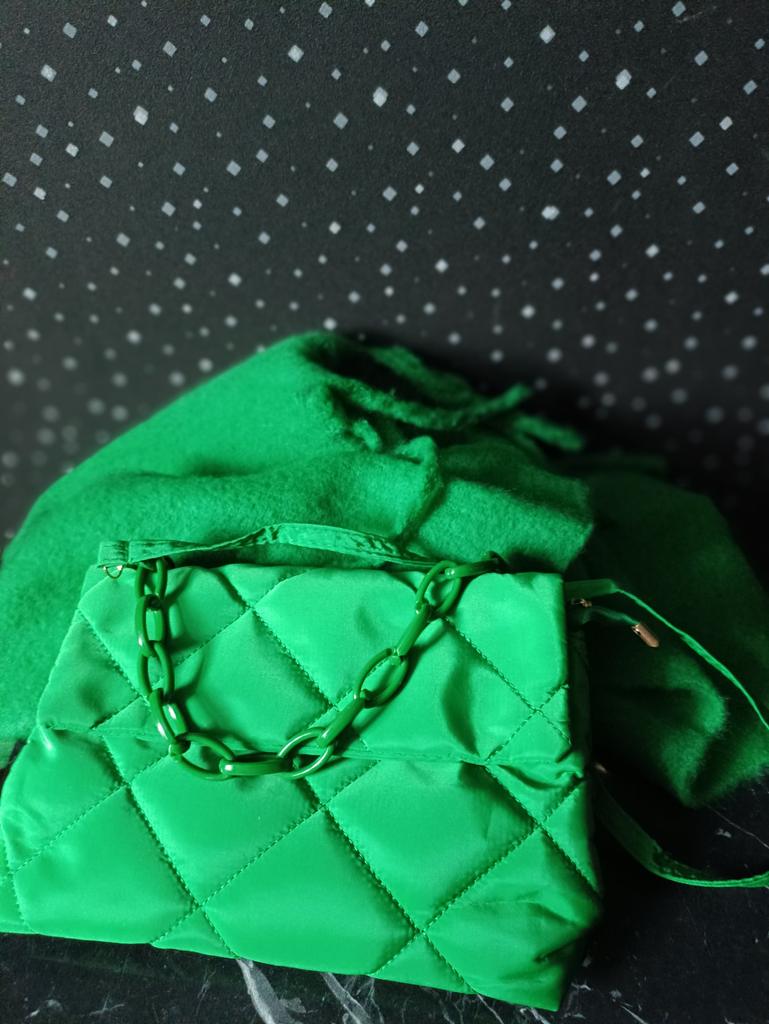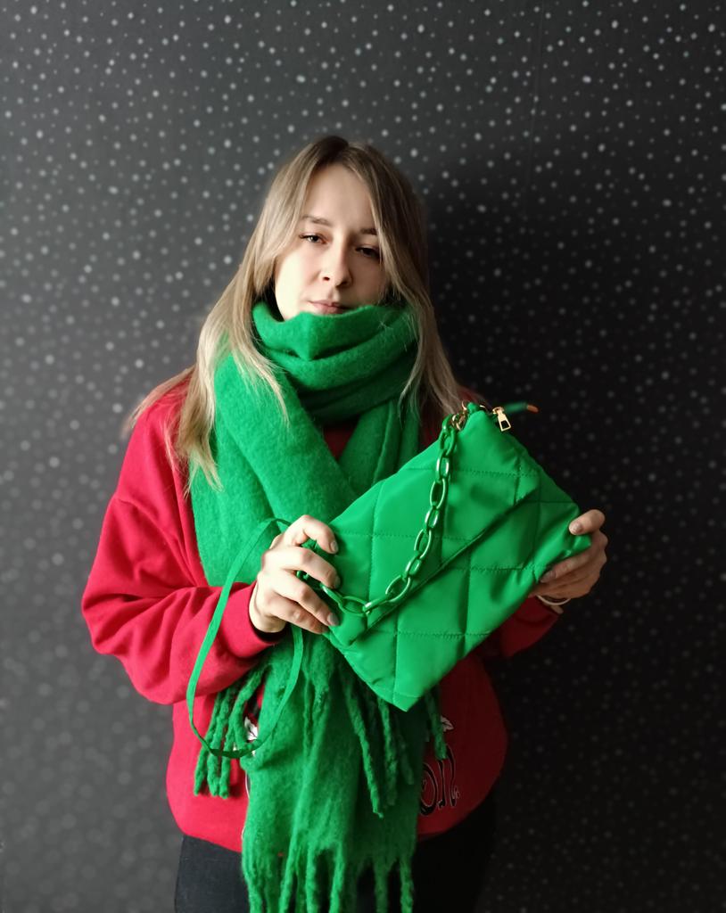 Яркая стёганая сумка. Заказывала вместе с шарфом, и они подошли по цвету, что очень порадовало! (Кому интересно, ниже обзор на шарф) Сумка не маленькая и не большая, как раз такая, какая нужна работающей женщине. Застёгивается на молнию и затем на две магнитные кнопки, причем кнопки застёгиваются сами- стоит поднести верхний клапан к сумке. Внутри одно отделение. Имеется декоративная акриловая цепь в тон сумке и длинный ремешок из ткани сумки. Ткань плотная, непромокаемая- самое то на нашу зиму! Вообще, я очень довольна сумкой и вам рекомендую.