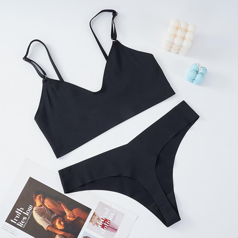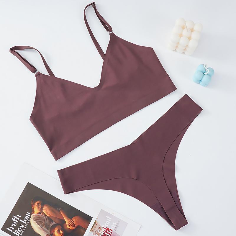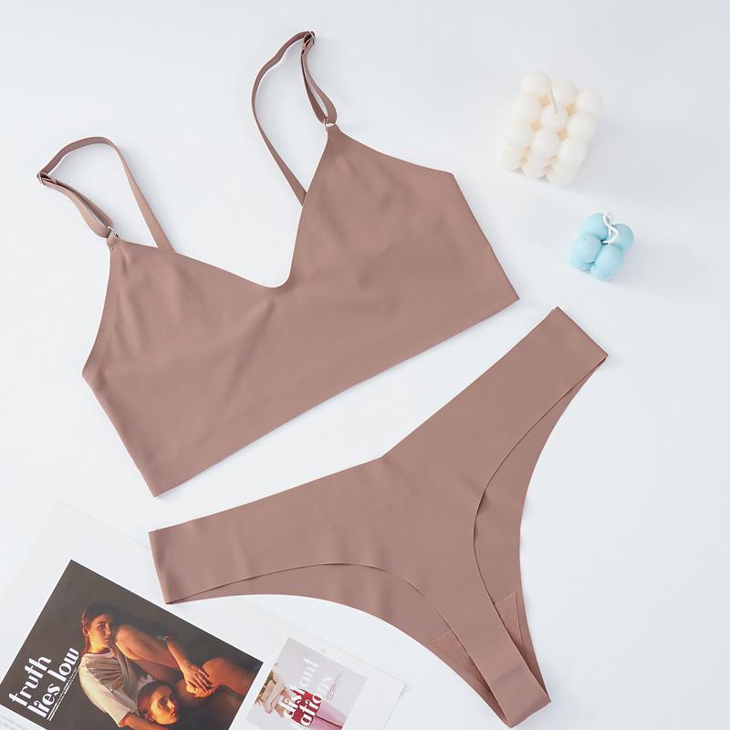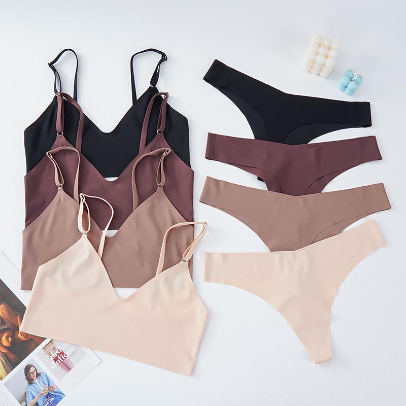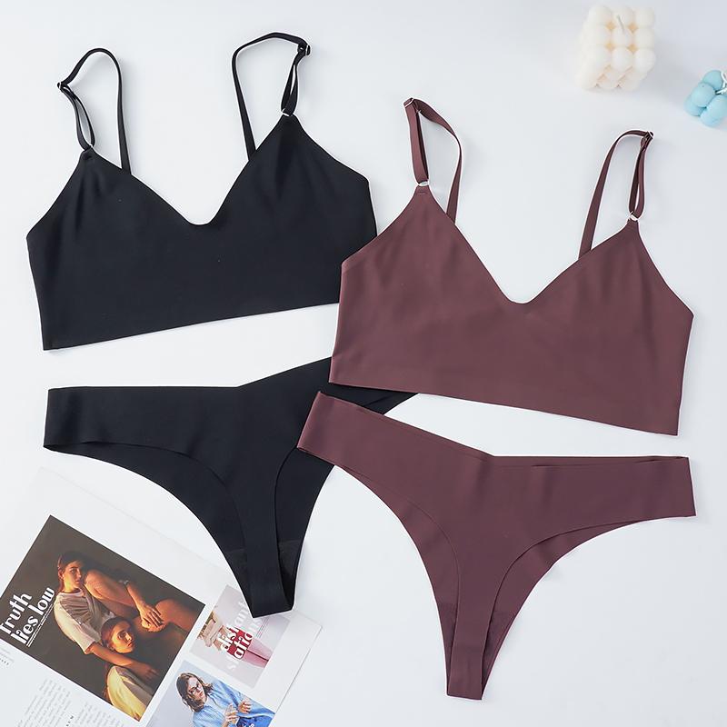 Женский комплект с бюстгальтером, трусики, сексуальный шелковый бюстгальтер без косточек, бесшовные укороченные топы для фитнеса и сна, нижнее белье и стринги, комплект женского нижнего белья