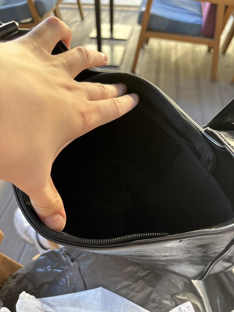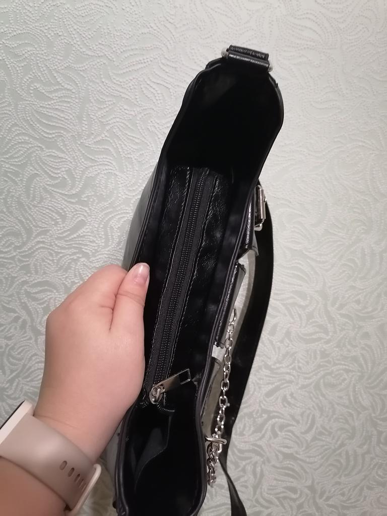 Внутри сумки маленький карман без замка, подкладка чёрная, а не серая. И ещё один Весомый минус, очень маленький замок, и соответственно большие дыры по бокам. Ожидала совсем другого.
