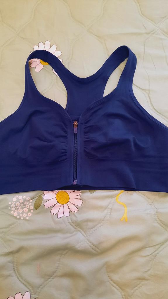 Спортивный бюстгальтер-топик тёмно-синий, есть поролоновые вставки,но мне без них удобнее, так как вставки мелкие и маленькие по размеру, лучше без них,но опять же кому как нравится,заказ 3хл на ог 110,опг 95,пришёлся в пору,нигде не давит,снизу широкая резинка, по спинке лямки совмещены,что очень хорошо, они не сваливаются и не надо постоянно их поправлять, застёжка спереди на пластиковую крепкую молнию, мою грудь держит нормально,для дома на лето очень хорошо. Пошив аккуратный, вещь фабричная и качественная, мне эта модель очень понравилась, могу рекомендовать.