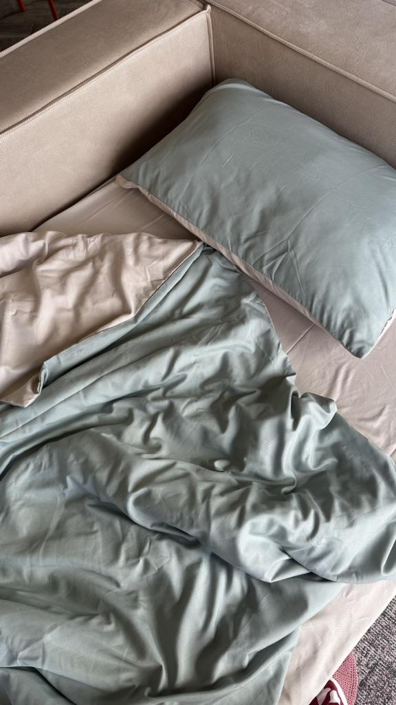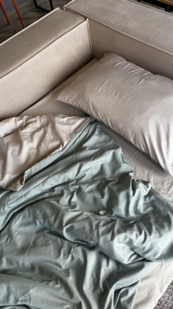 Постельное белье безумно красивого цвета. Простынь кремовая, а вот пододеяльник и наволочки двухсторонние: кремовые с одной стороны и серо-голубые с другой. Ткань очень приятная на ощупь, мягкая и нежная. Стирку белье прошло успешно, ничего не скаталось. Хочу заметить, что белье абсолютно не электризуется. Соотношение цена-качество этого комплекта идеальные 👌🏽