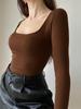 Повседневные женские футболки с квадратным воротником и длинными рукавами, зеленые осенние обтягивающие сексуальные однотонные базовые укороченные топы, модная уличная одежда