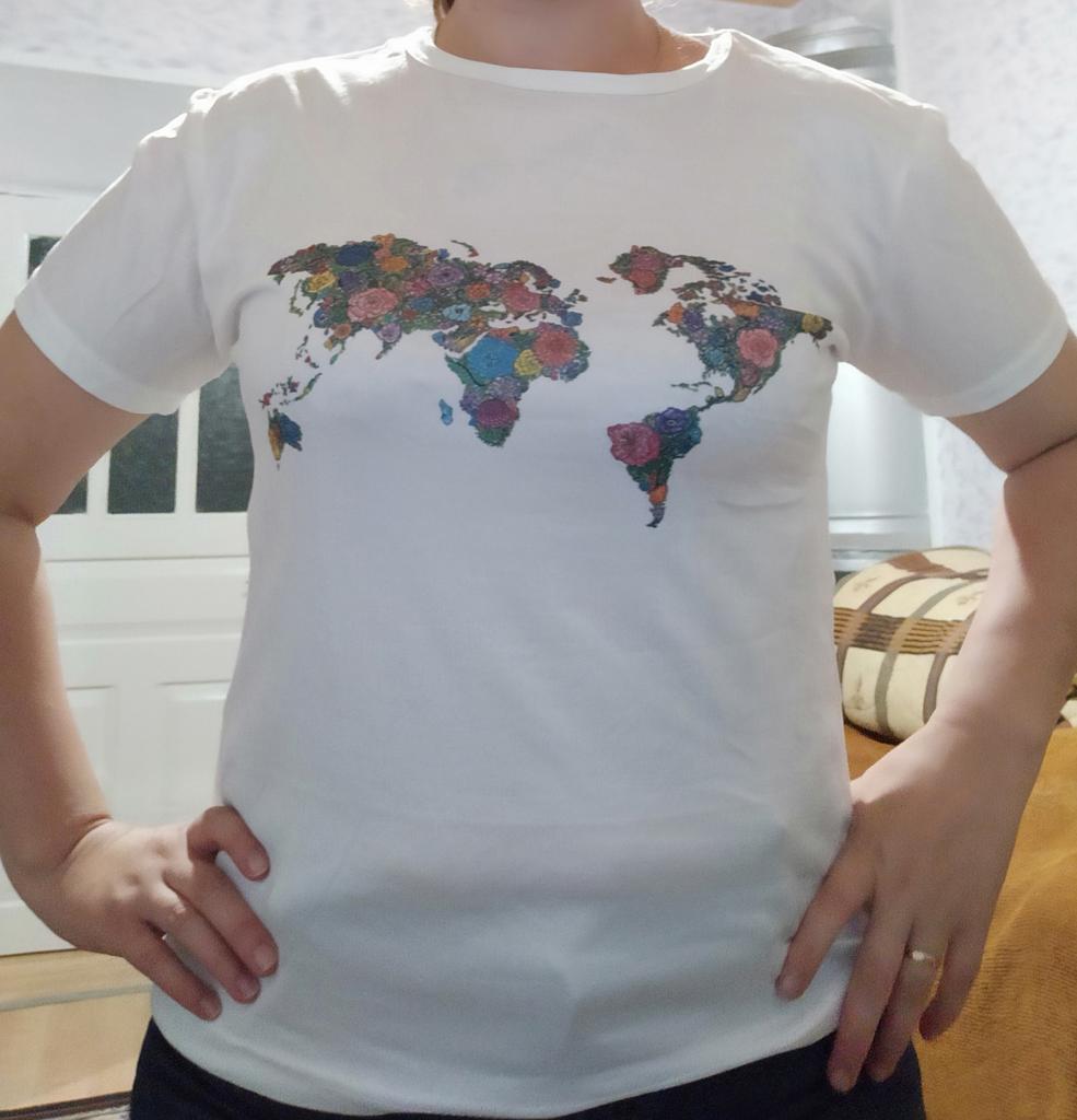 Выиграла футболку за 1 рубль,футболка с короткими рукавами. Пришла хорошо упакована, постороннего запаха не имела,на ощупь приятная. Принт пропечатан хорошо, ткань смесь хлопка и полиэстера.Изделие прошито нитками в тон основной ткани, торчащих ниток нигде не увидела.Отлично сочетается с шортами и джинсами из лёгкого денима.После стирки с тканью ничего не произошло. Она не полиняла, не изменила свою форму (не села и не растянулась). Рекомендую, спасибо Joom♥️