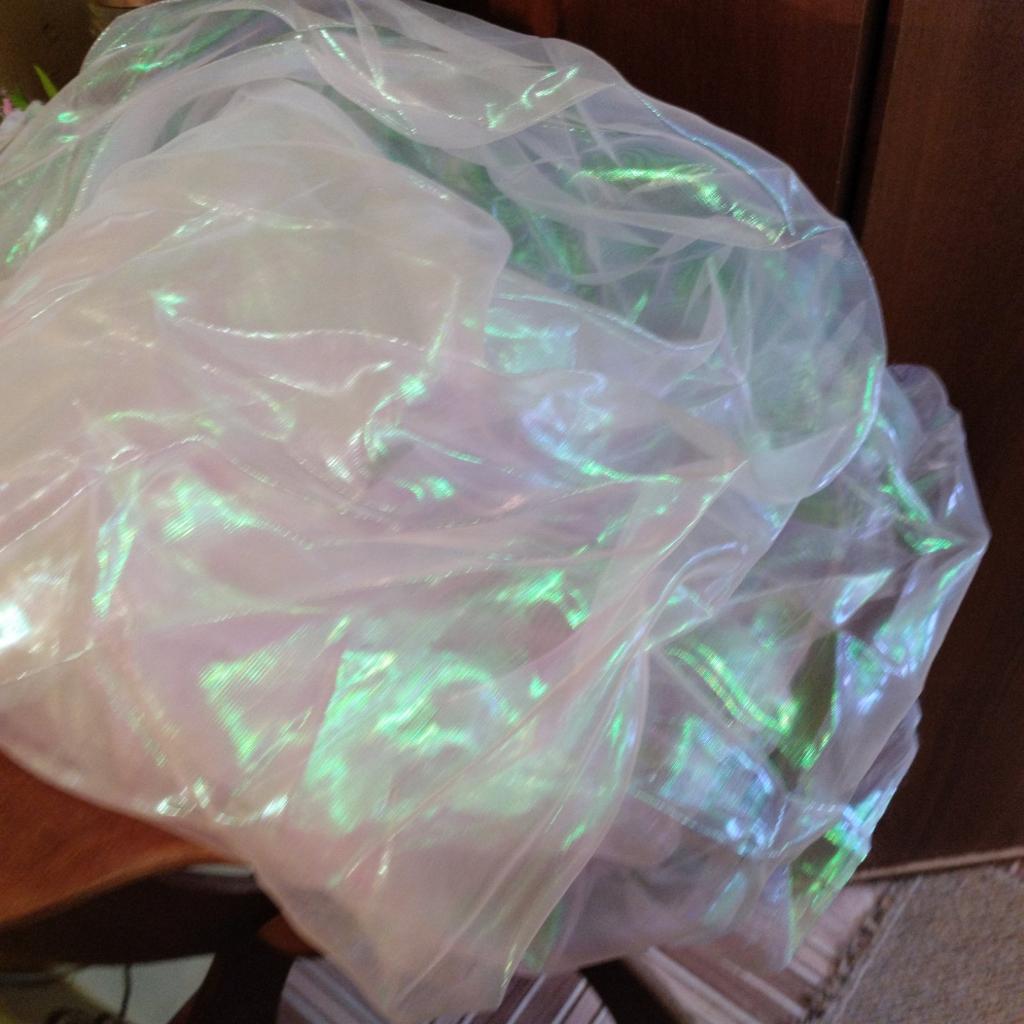Органза, в пакете, мятая как.... откуда то достали. Заказала 2 отреза , прислали двумя кусками, короче, не тудэмо-нисюдэмо. Теперь надо думать, как его приспособить, куда пришпандорить. :). Ткань красивая, в принципе, как на фото.