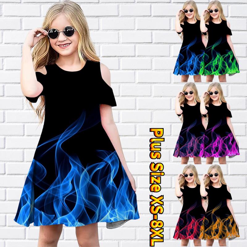 Платья с цветочным голубым пламенным принтом для девочек, детское праздничное платье с открытыми плечами для девочек, платье принцессы, платье с короткими рукавами для девочек старше 4 лет