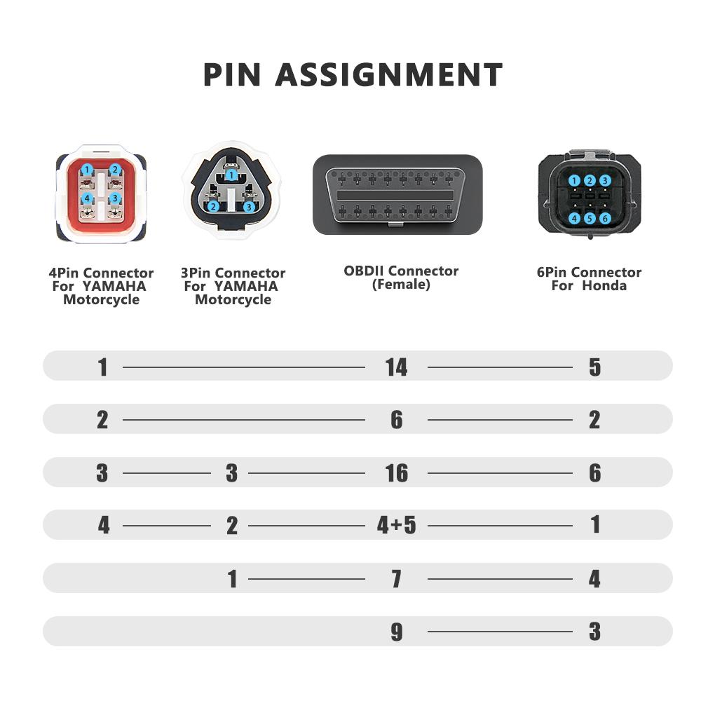 Этот кабель позволит вам подключить совместимые диагностические инструменты мотоциклов Yamaha или мотоциклов Honda с 3-контактными или 4-контактными разъемами к существующим 16-контактным инструментам OBD2, что позволит вам считывать коды неисправностей на всех мотоциклах Yamaha или Honda, совместимых с OBD2