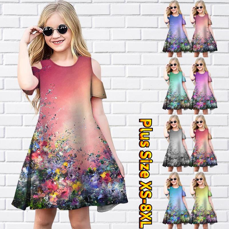 Платья с цветочным принтом для девочек, детское праздничное платье с открытыми плечами для девочек, платье принцессы, платье с короткими рукавами для девочек старше 4 лет