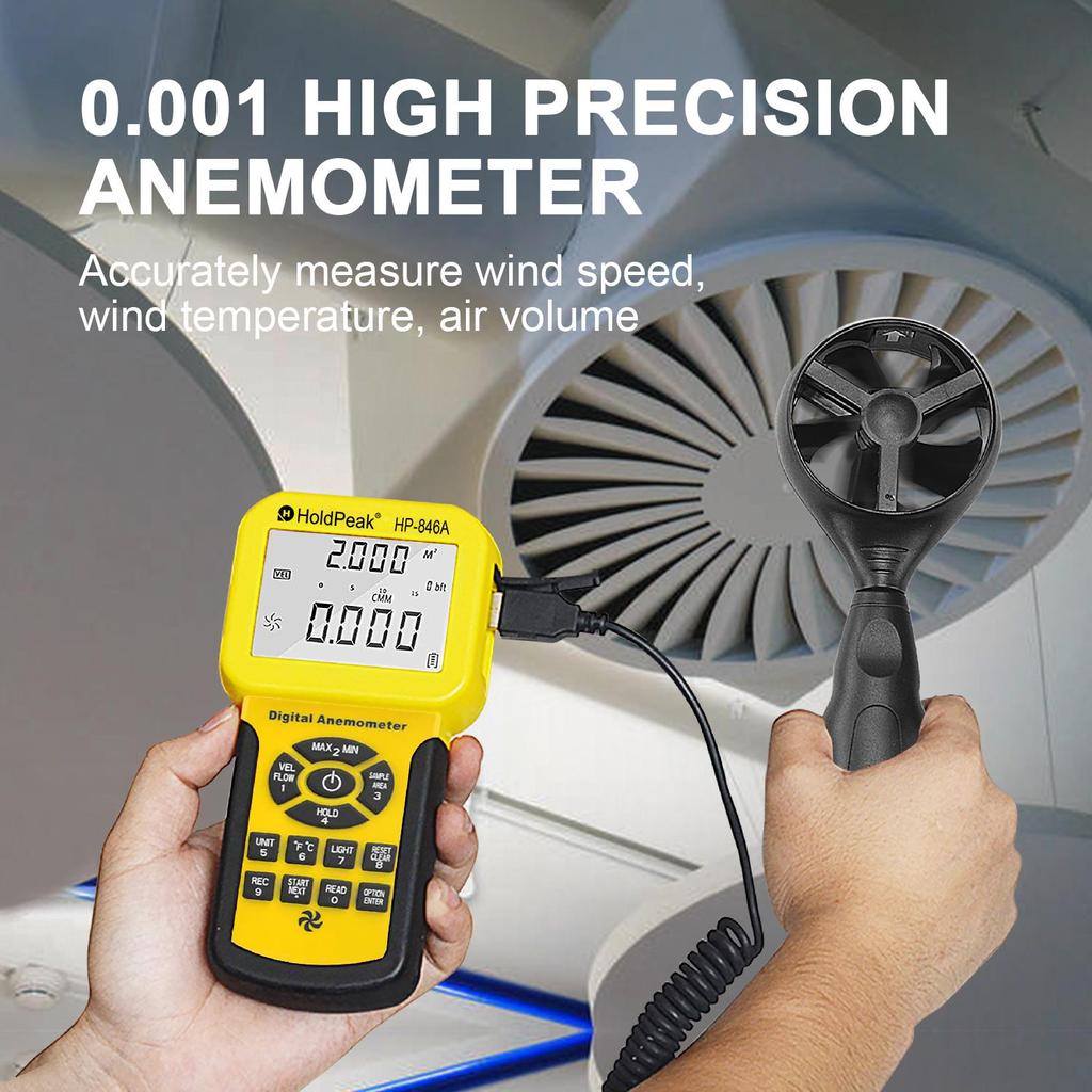 0,3 ~ 45 м/с, датчик скорости ветра HoldPeak HP-846A, цифровой анемометр, измеритель объема воздуха, прибор для записи данных и портативный тестер