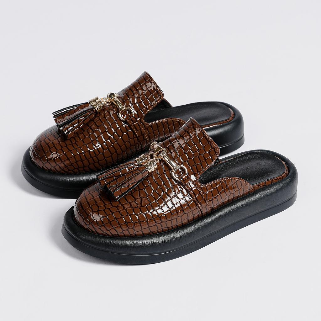 Женские сабо с круглым носком на плоской подошве, на платформе с кисточками и металлическими украшениями, женская модная повседневная обувь, летняя черная, темно-коричневая 43 — купить товар онлайн с бесплатной доставкой до всему миру!