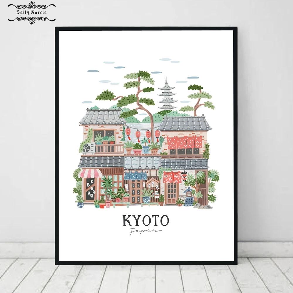 Мультяшная архитектура, художественный постер, Париж, Рим, Киото, иллюстрация, печать на холсте, фотографии для декора гостиной, интерьерные картины