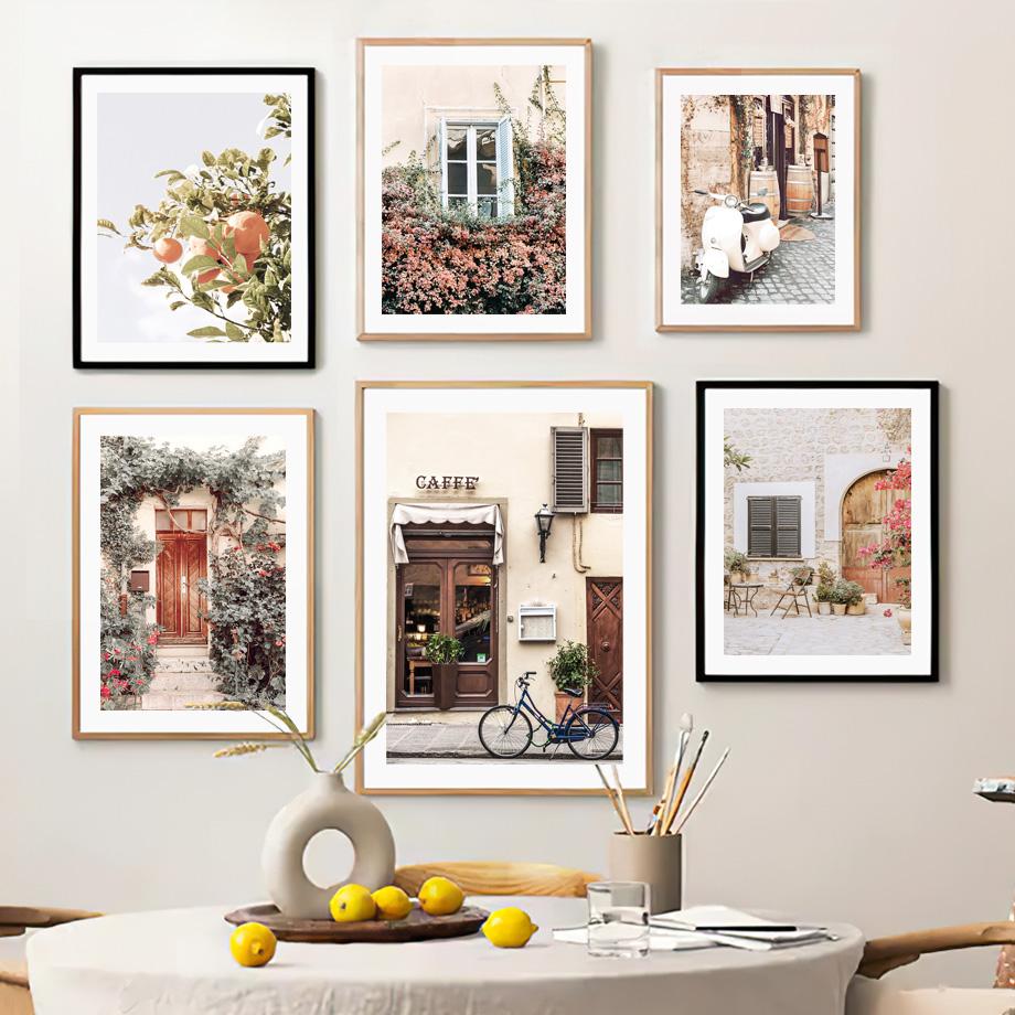 Ретро город цветок вид на улицу автомобиль мото велосипед подоконник настенные постеры художественная живопись на холсте и принты картина для декора гостиной
