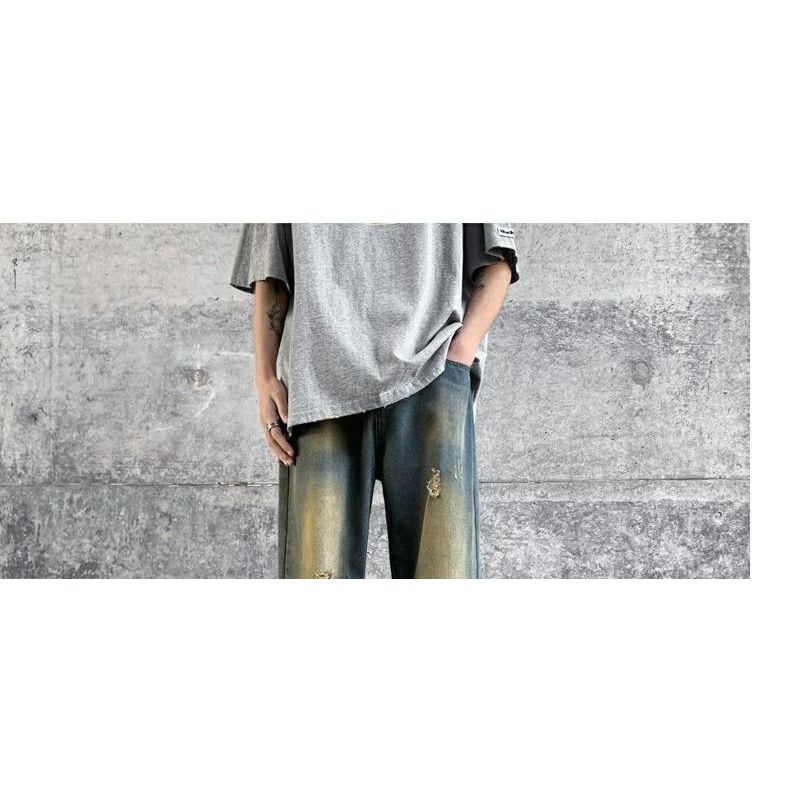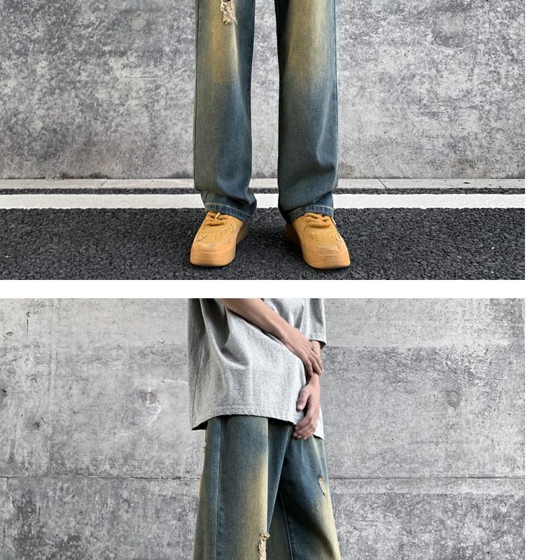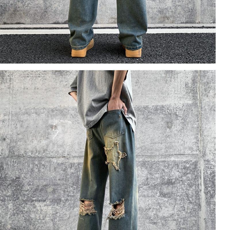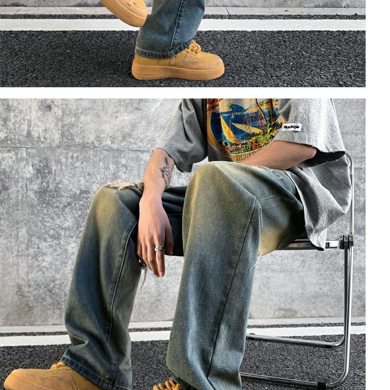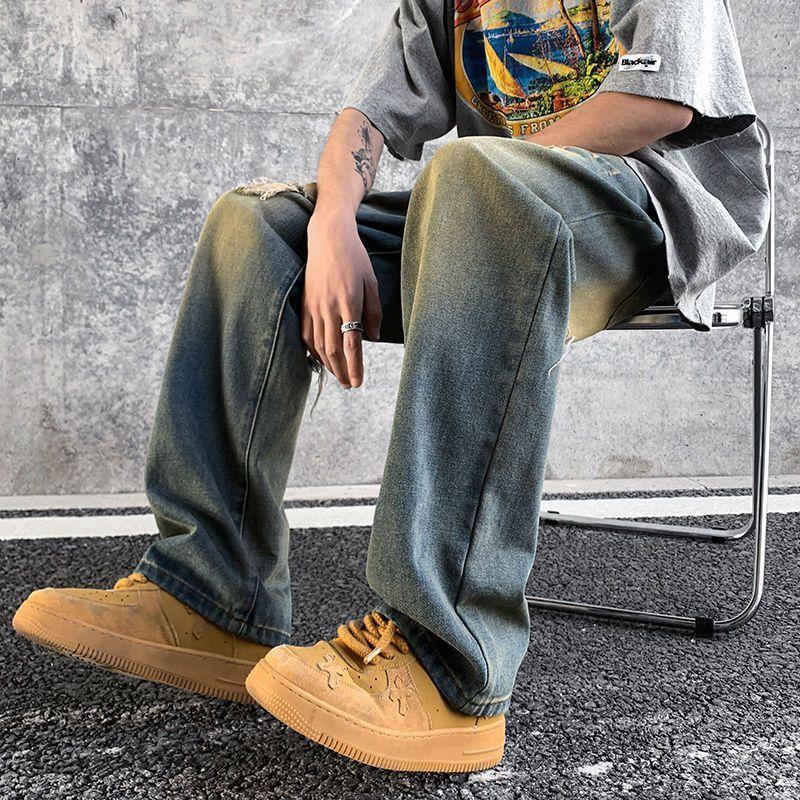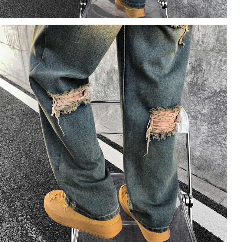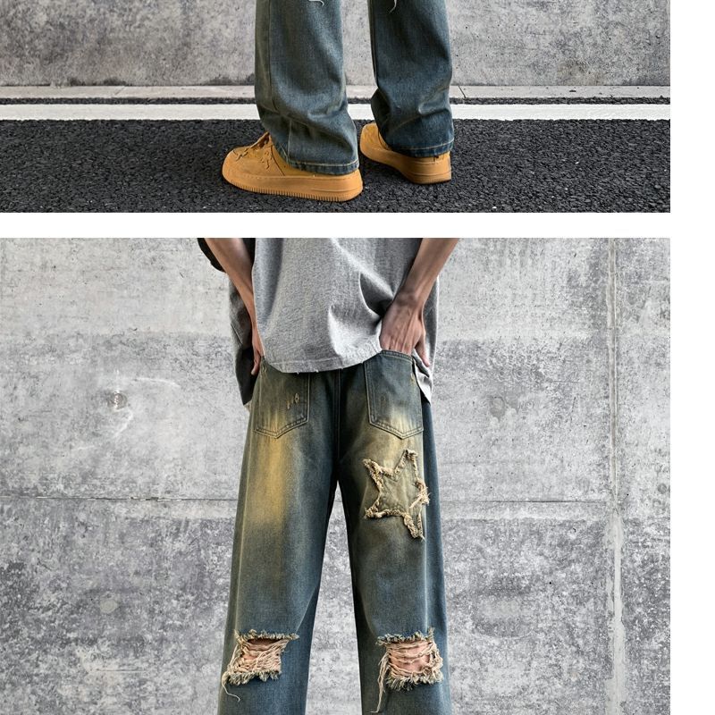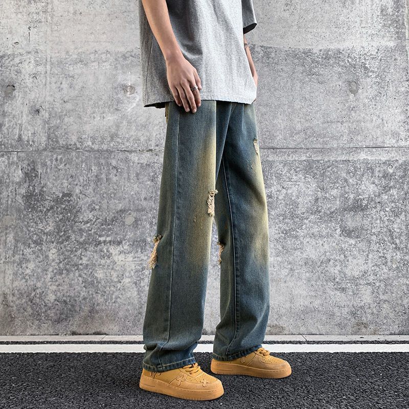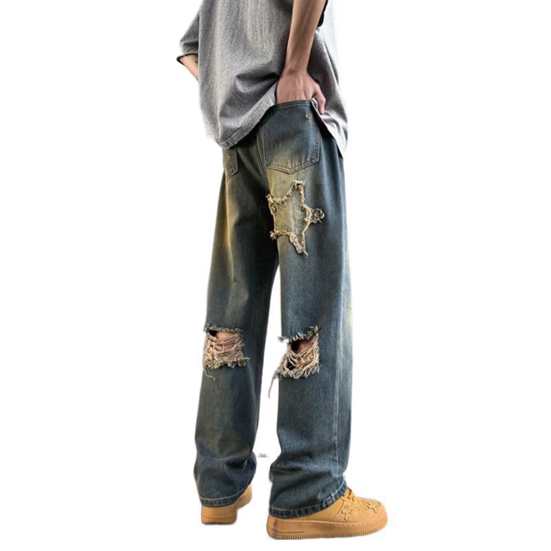 Мужские джинсы, летние американские ретро уличные брюки с дырками, свободный дизайн, нишевые широкие брюки
