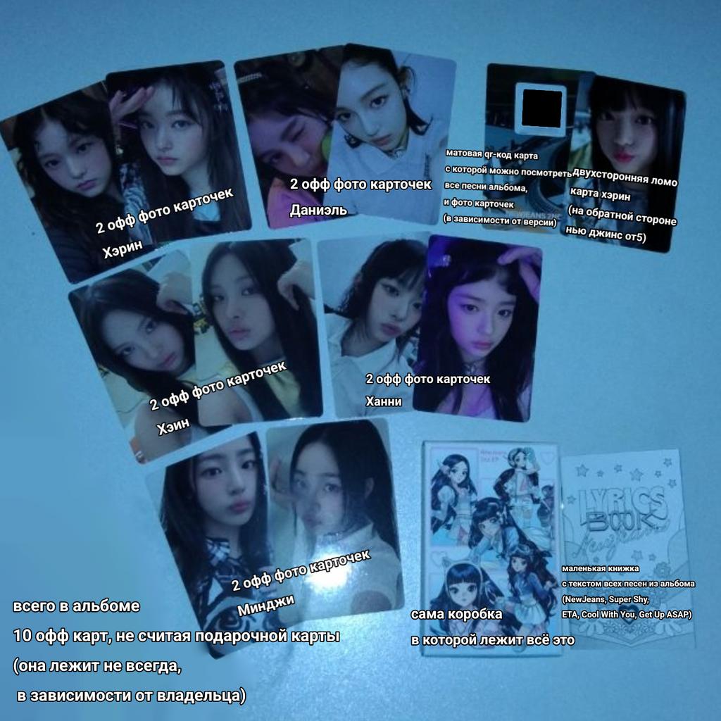 Заказала альбом newjeans B версии. В подарок шла ломо карта(на одной стороне ханни,на другой-минджи). Всего в альбоме 10 карт, для меня это очень много😳 Без дф.Маленькая книжка с текстом песен Cool with you, super shy, NewJeans, Get Up,ETA,ASAP.И карточка с QR кодом Очень рада покупке. Советую!!