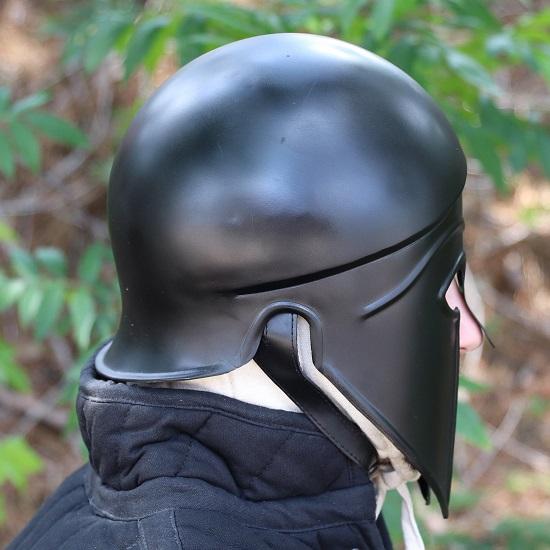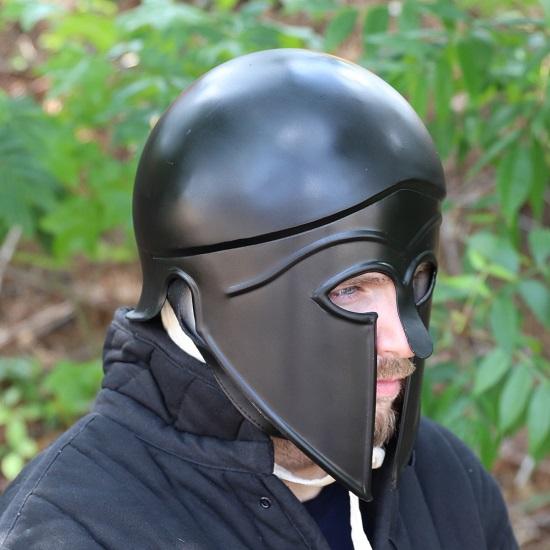 Греческие гоплиты носили этот шлем в коринфском стиле во время битвы.. Помимо обеспечения защиты, главной особенностью этих шлемов была выдающаяся работа кузнеца по выбиванию целого шлема из цельного листа металла.. Дизайн имеет Т-образную форму для глаз и рта, а также защиту носа.. Несмотря на простоту, безупречное качество изготовления придает этой одежде что-то особенное.. По бокам есть отверстия для ушей, чтобы вы могли слышать команды при построении фаланги.. Внутри мягкая кожаная подвеска с регулируемым ремешком и пряжкой обеспечивает комфорт.. Этот шлем защищает верхнюю часть головы, щеки и шею.. Этот шлем из стали 20-го калибра дополнит ваш образ.