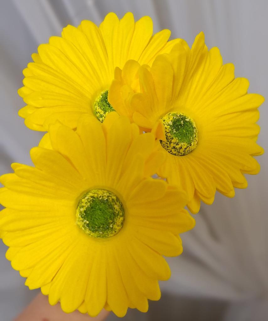 Цветочки яркие, мягкие. Цветок соединения со стебельком из мягкого селикона, пестик присоединен к проволоки, легко вставляется и вынимается. Для декора подойдут. Заказала два разных букета, в одном было на один цветок меньше. В целом всем довольна.