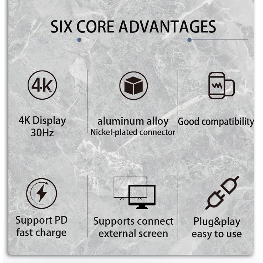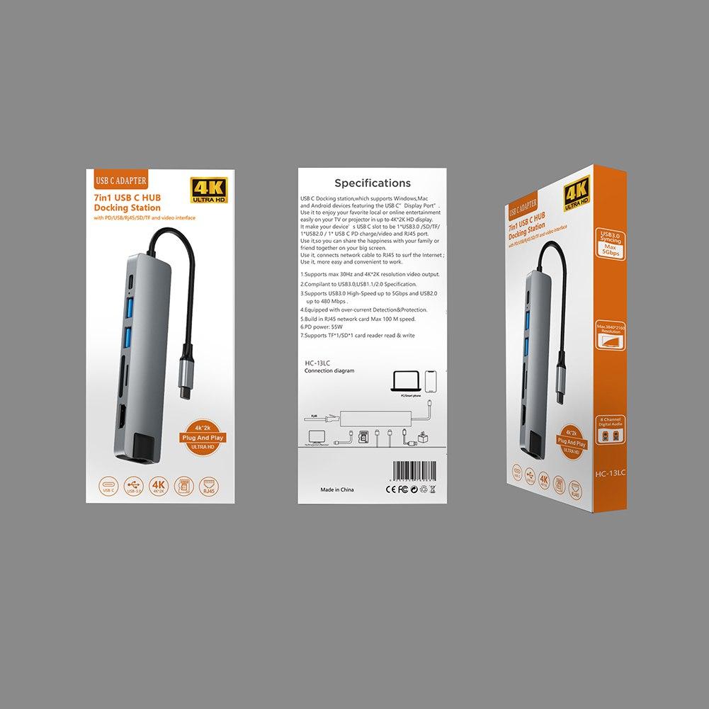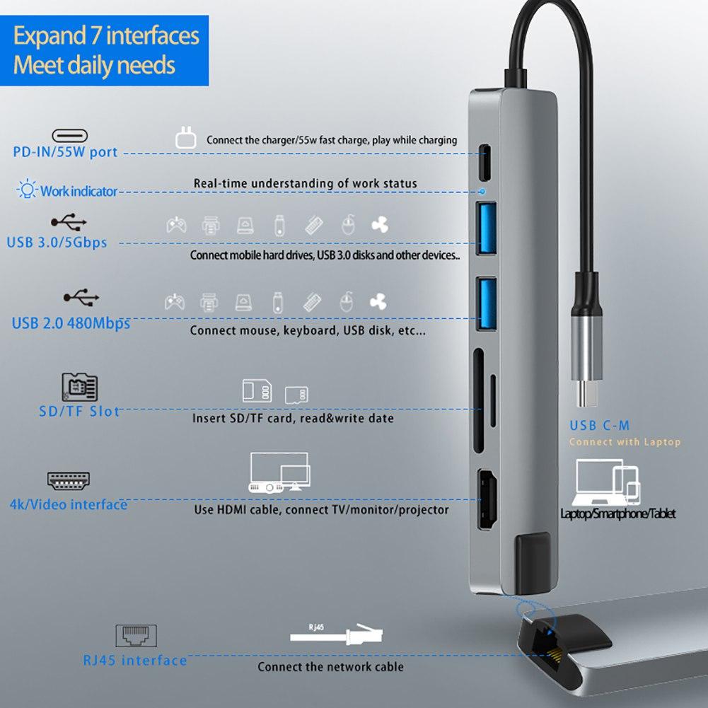 【Обширный концентратор 7 в 1 USB C】Многопортовый адаптер usb-c концентратора включает в себя быстрый порт Ethernet / RJ-45, порт для зарядки TYPE C 3.1 55W PD, порты USB3.0 и USB2.0, 4K HDMI-совместимый видеовыход. M-icroSD & TF кард-ридер.