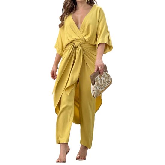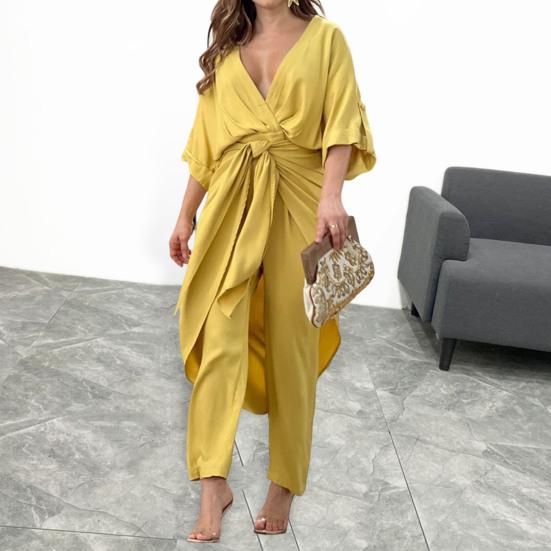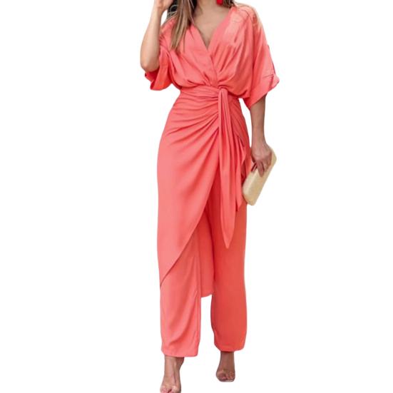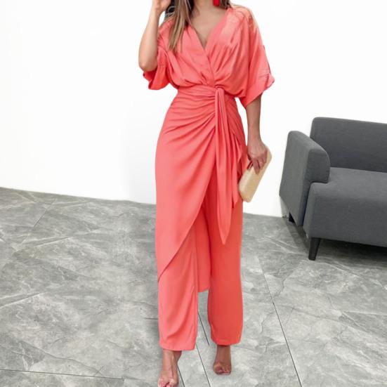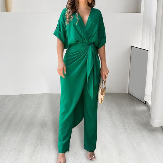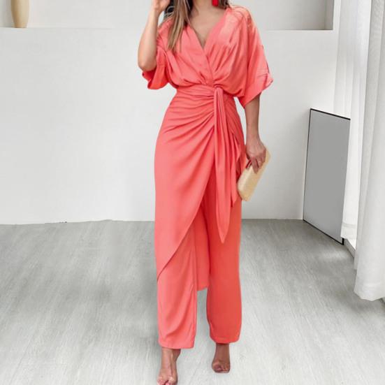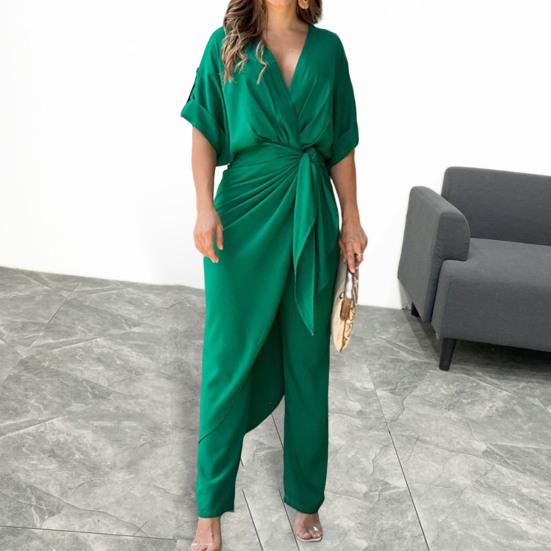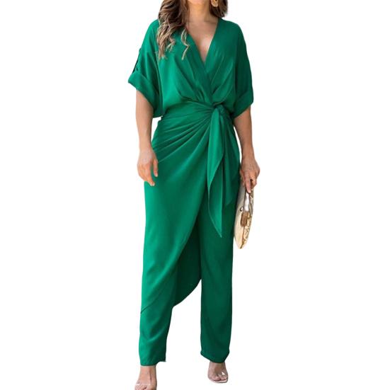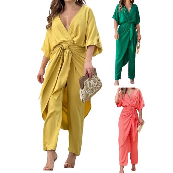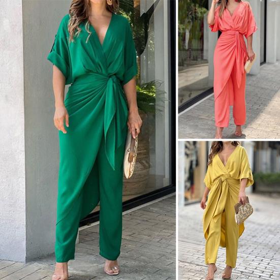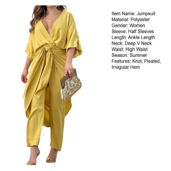 Женский комбинезон для вечеринок с глубоким V-образным вырезом, сплошной цвет, плиссированный узел, нерегулярный подол, платье длиной до щиколотки, стиль OL, женский комбинезон для поездок на работу, женская одежда