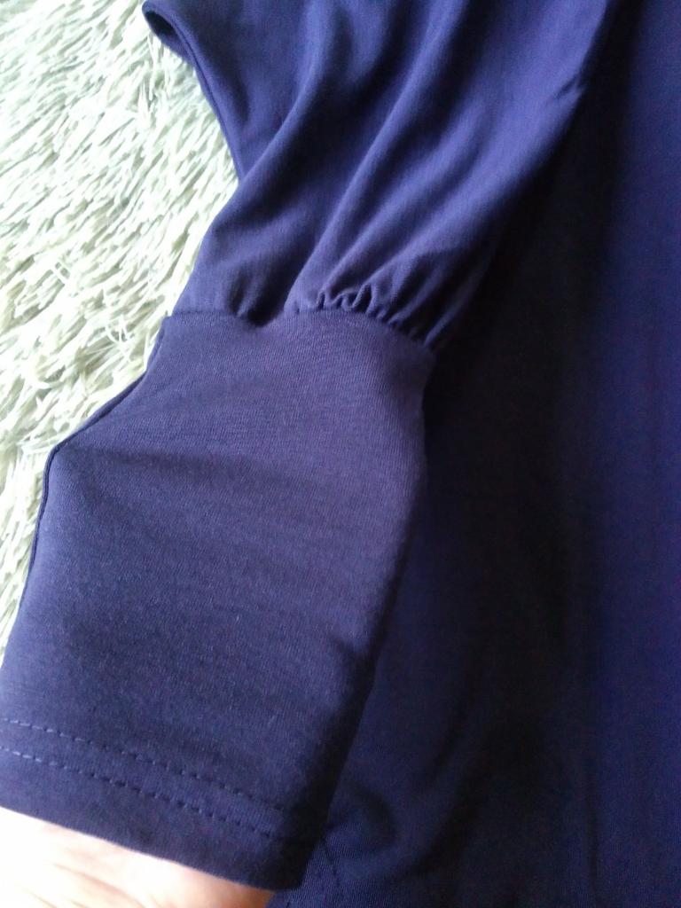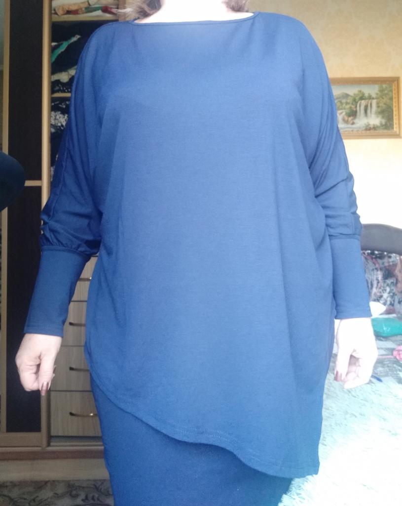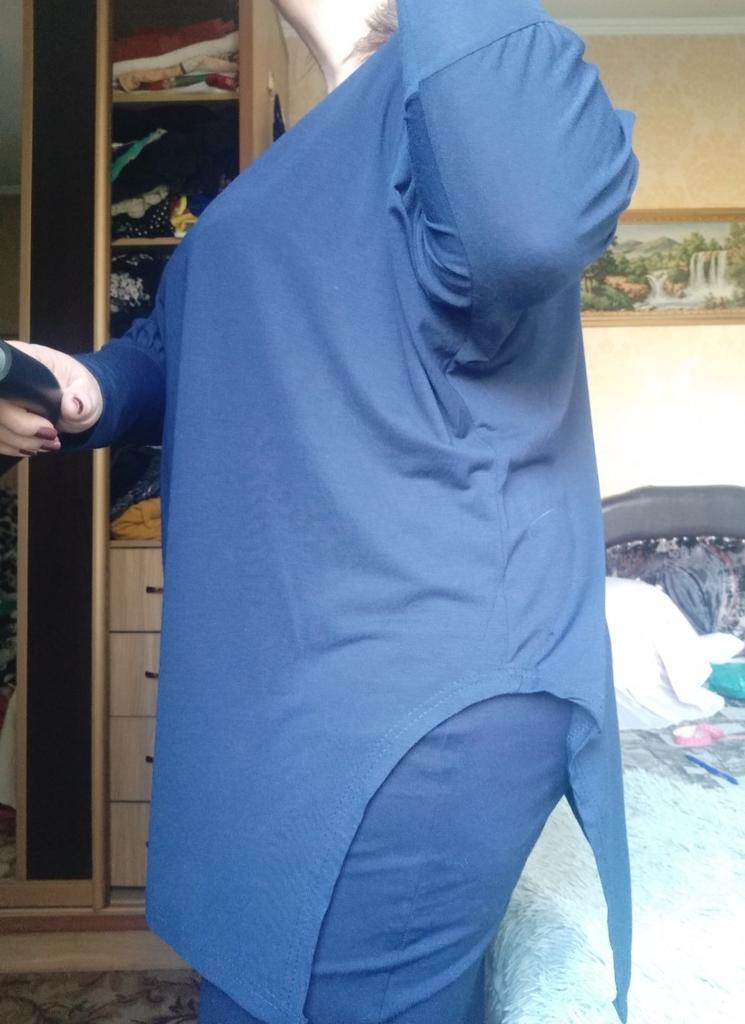 Не знаю что написать... Задумка модели хорошая. Особенно понравился узкий, длиный манжет. Он придаёт изящество.Дальше "мышь". Она прячет все то, что ты хочешь спрятать. Разные углы подола удлиняет фигуру, т.к. ломаная линия визуально меняет представление о форме.И этот приём, больших девочек делает НЕБОЛЬШИМИ! Конкретно эта модель большемер!Цвет насыщенный. Качество, как майка(тоненькая, мягенькая). Поэтому в ней хорошо будет спать. А вот носить... Здесь- кому что надо! Для тела приятно. Для украшения образа? Не ждите элегантности и чёткой формы. Просто удлиненная кофточка - футболка. Пусть будет пять звезд. Я добрая!
