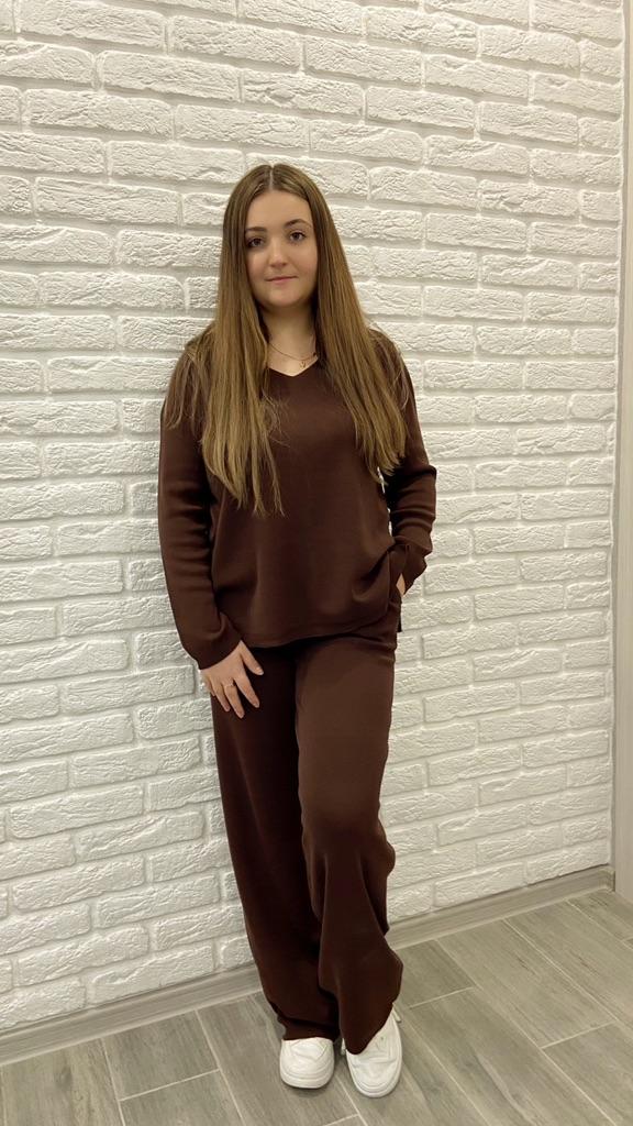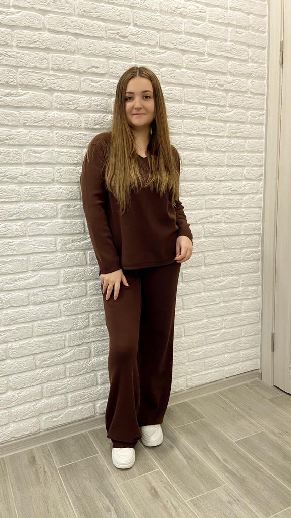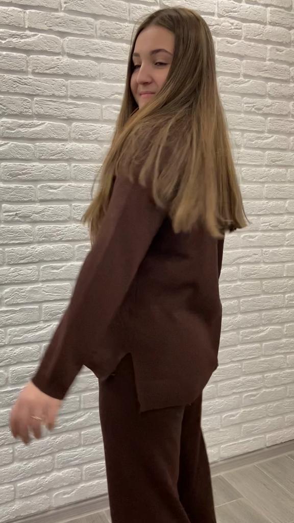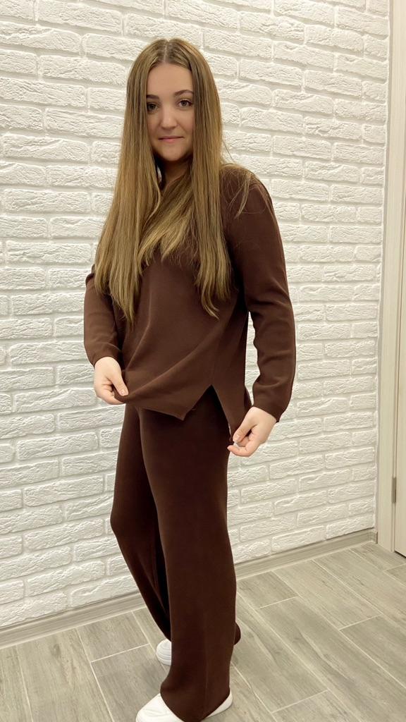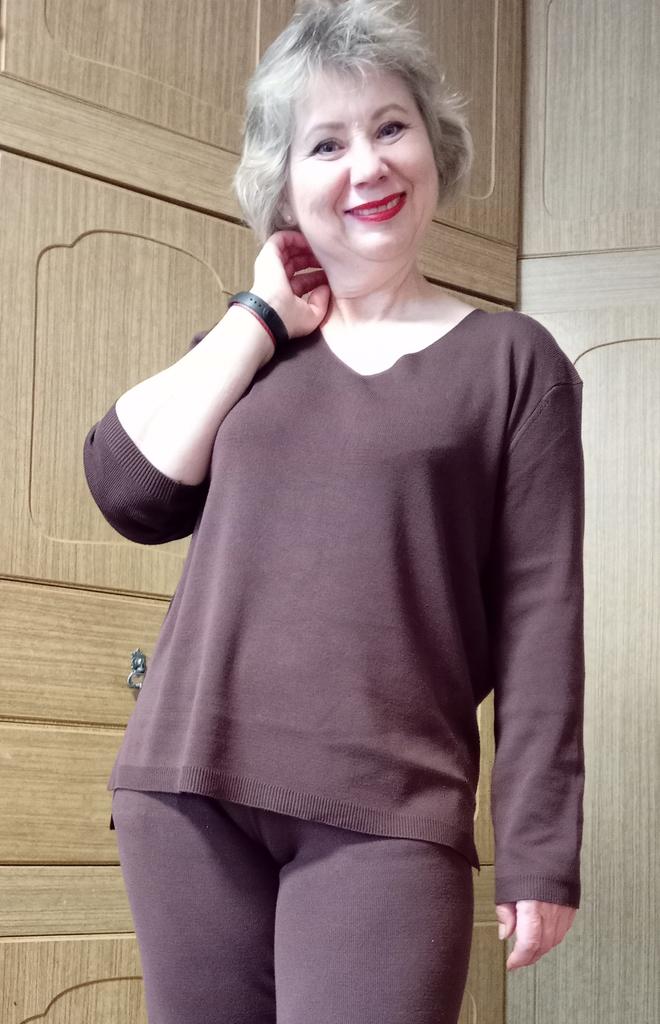 КОМПЛЕКТ "ГОРЬКИЙ ШОКОЛАД" Давно искала себе тонкий трикотажный комплект, и довольна ......благодарю Катюшу Комиссарову за наводку Модель простая: верх - обычный блузон с разрезами, с V -образным воротом, с длинными рукавами.... Низ - прямого кроя на широкой эластичной резинке, с карманами Материал: приятная синтетика, комфортная, не электризуется, тянется.... Выбор цвета - темно- коричневый, визуально "горький шоколад" На мои параметры 93/87/107 рост 162 см единый размер вписался отлично....только длина брюк требует каблук или высокую платформу обуви....( на высоких девочек подойдёт) Реальные измерения без натяжения: Длина брюк 105 см ОТ брюк 68 см ОБ брюк 88 см Длина рукава 55,5 ОГ 104 см Длина изделия переда/ спинки 61/65 см Костюм мне понравился, можно миксовать И он до максимума 50 размера Сезон: весна-прохладное лето- теплая осень Однозначно рекомендую Благодарю продавца за маленький подарок - браслет с подвижной сердечко