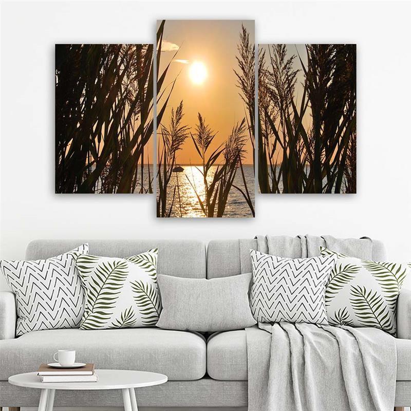 Картина из трех частей, напечатанная на холсте Озеро Трава Закат