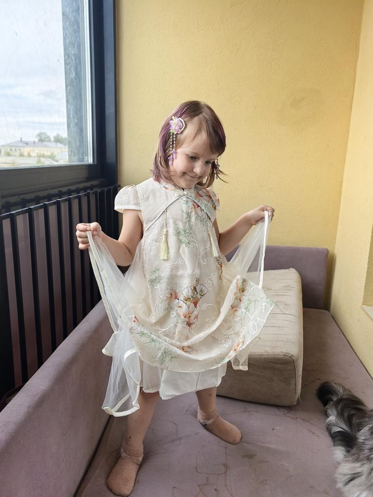 Платье хорошее за такие деньги. Юбка конечно не такая пышная, как на фото, надо вниз подъюбник. Девочка у нас худенькая, рост 105. Самое важное нужно измерять в груди, у нас 58 см, заказала больше, чтобы не было впритык. Поэтому надо чуть подшить подмышками, и будет идеально. Дополню отзыв когда отглажу