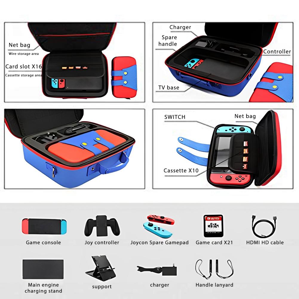 Большое пространство для хранения Два чехля для хранения вмещают 26 игровых карт, консоль Nintendo switch и док-станцию, ремешок Joy-Con, ручку Joy-Con, адаптер переменного тока, USB-кабель и кабель HDMI. Есть 2 места для хранения внутри, и эластичный сетчатый чехол с одной стороны, в котором могут храниться различные аксессуары, с другой стороны есть отдельное пространство, которое отделено для размещения более крупных аксессуаров. Между двумя местами для хранения имеется защитная пластина для предотвращения столкновения аксессуаров с обеих сторон. Защитная пластина имеет слоты для карт памяти