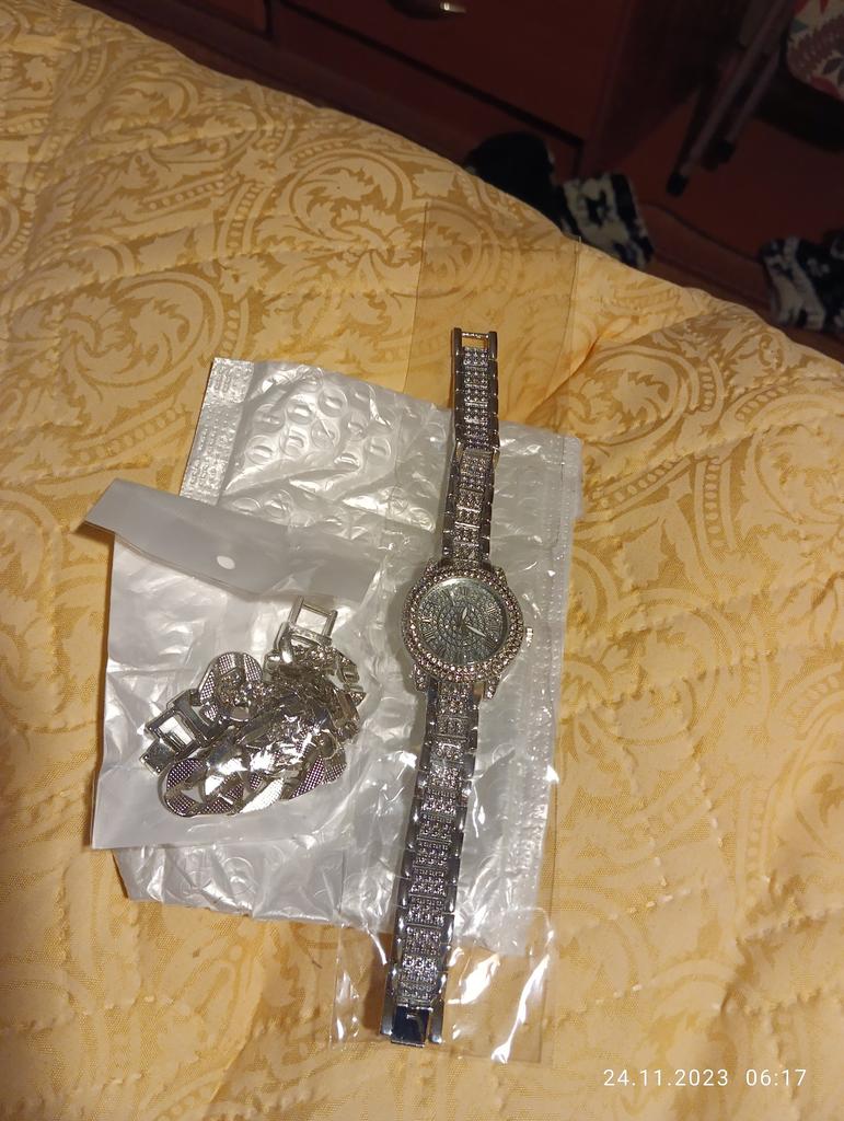 Комплект просто бомба!!!!! Сказать, что понравился, ни-че-го не сказать. Смотрится дорого-богато!!! Стразики всё на месте, замки рабочие и очень крепкие. Часики ходят, на "заводе имеется пластиковый ступор. Можно носить как по отдельности, так и вместе. Заказ шёл ровно месяц, пришёл хорошо упакованным, отслеживался. Очень довольна заказом!!! Джуму большое спасибо, продавца рекомендую!!!
