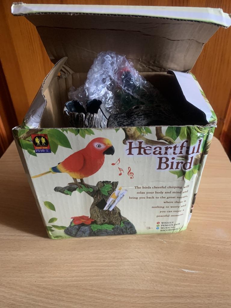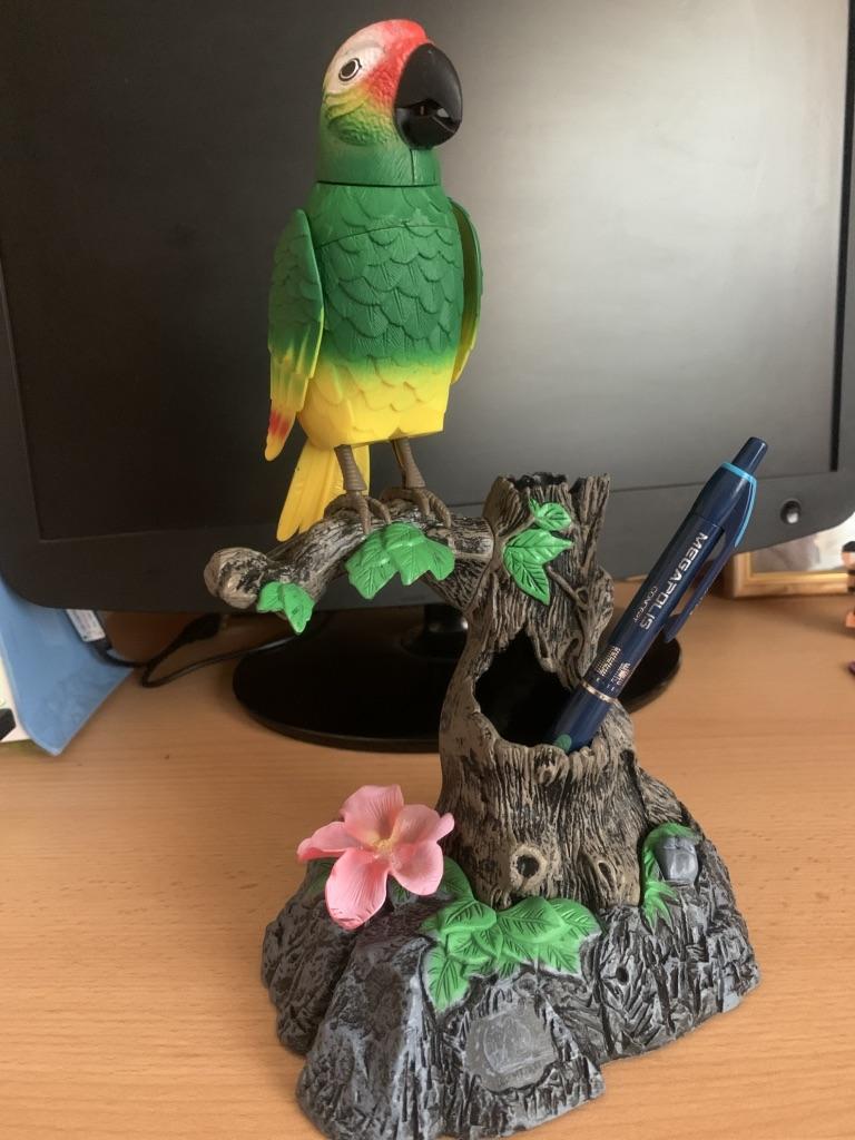 Это мой второй попугайчик, в первом случае была пара попугаев. Пришло давно, но долго доводила до ума в свободное время. Сначало не могла посадить крепко на ветку, применять силу не хотелось, боялась что сломается. Потом посадила, но он не двигался, только пел. Я уже с этим смирилась, что поделаешь, но повозилась ещё и ,,слава богу’’ он ожил. Попугаи на батарейках. Попробовала их вместе включить, так такая чихарда получилась. Яркая красивая игрушка, можно ставить ручки. Если чётко говорить - хорошо повторяет. Спасибо!