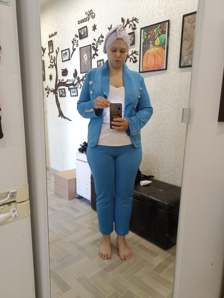 Отврвтительный костюм из самого дешового синтетического трикотажа. Полное разочарование. Очень ждала именно костюм, поняла что его место на помойке. Лацканы у пиджака разной фопмы, нитки торчат, швы тянут, не застегивается на пуговицы, золотые пуговмцы дисгармонируют с тканью очень дешовой, мзделие без подклада, без вытачек, форму не держит вообще. Может если бы ткань была бы поприличнее, то смотрелся бы хоть как то. Цвет тоже не соответствует, голубой а не синий, на фото явно другое изделие из другой ткани с другим кроем. Выброшенные деньги. Не рекомендую ни продавца ни изделие никому
